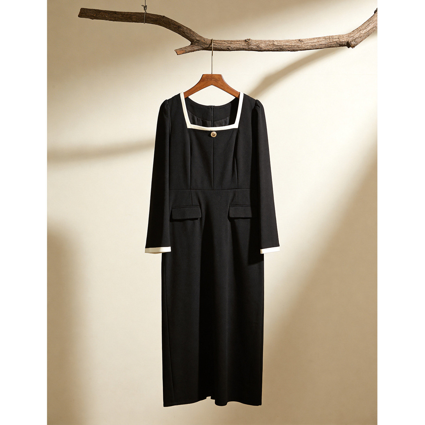 黑色方领长袖连衣裙女2026年春季新款赫本风气质收腰显瘦包臀裙子