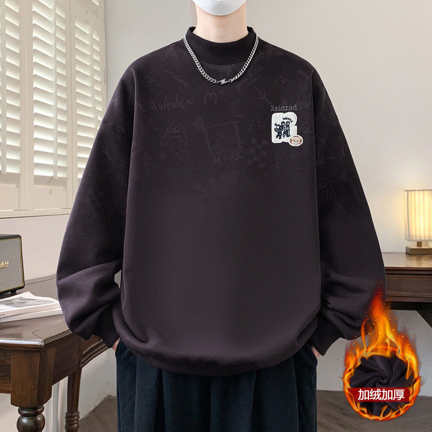 半高领加绒加厚卫衣男款秋冬季潮牌卡通动漫青少年内搭打底衫上衣