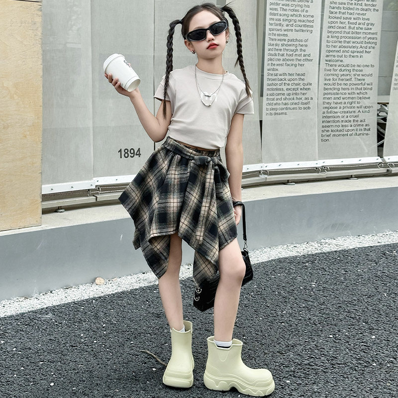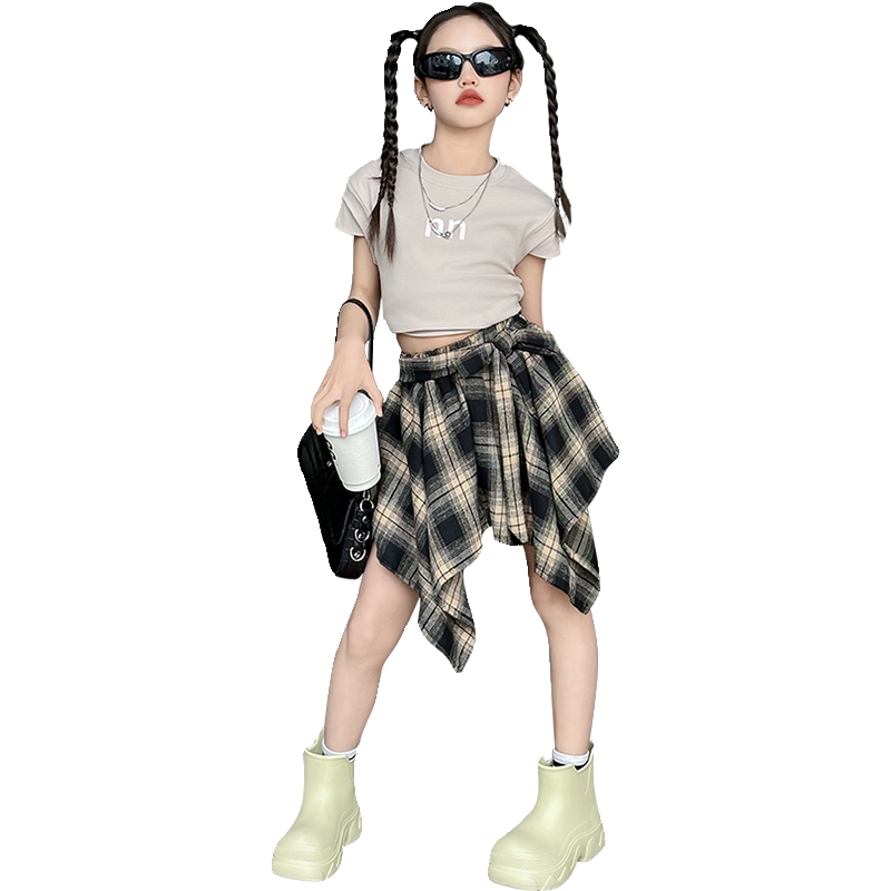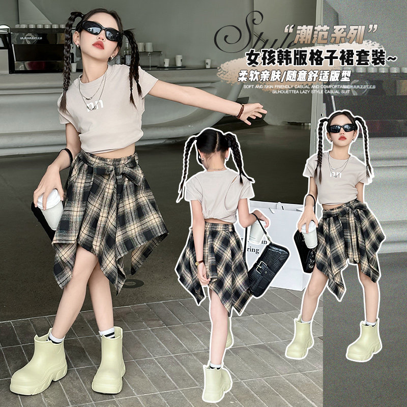 女童半身裙夏季时髦女大童炸街不规则格子短裙套装儿童爵士舞裙子