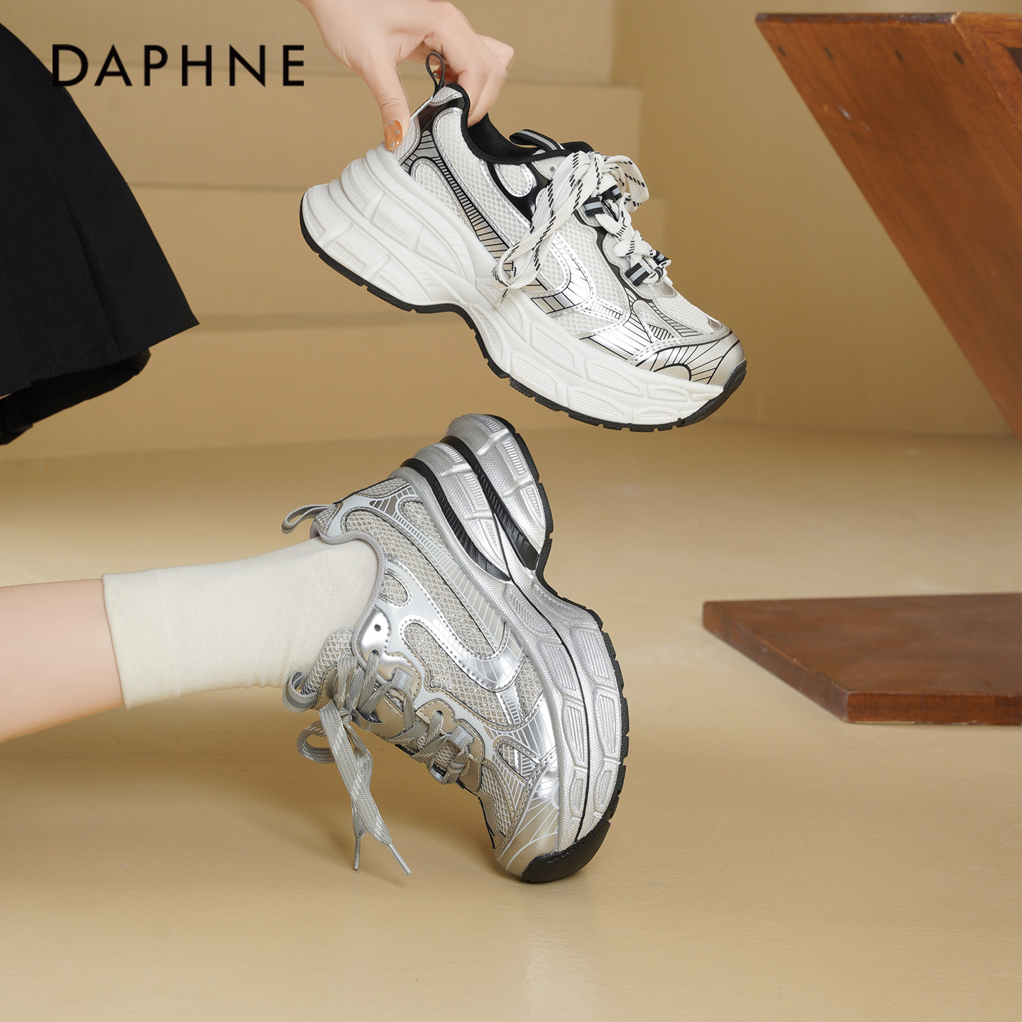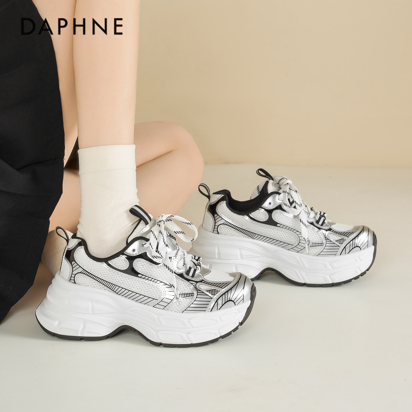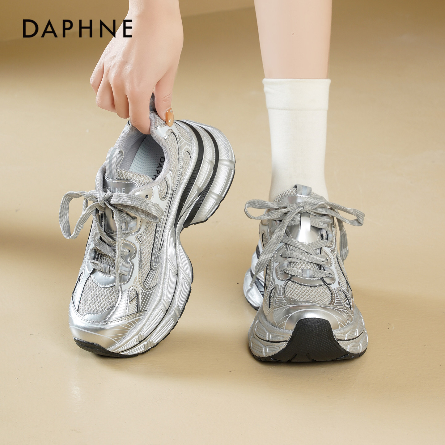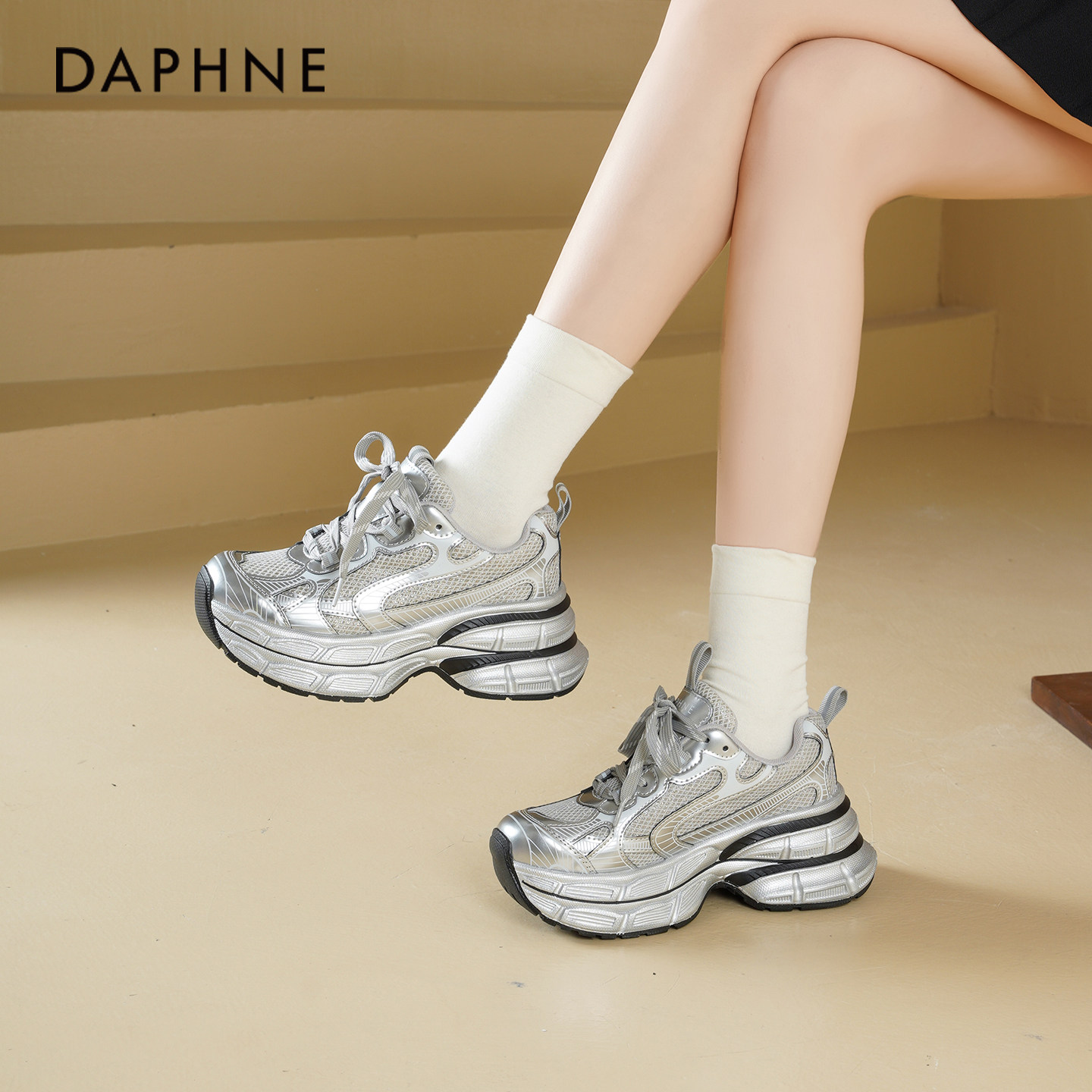 达芙妮银色老爹鞋女2026新款春季厚底增高松糕鞋百搭休闲运动鞋女