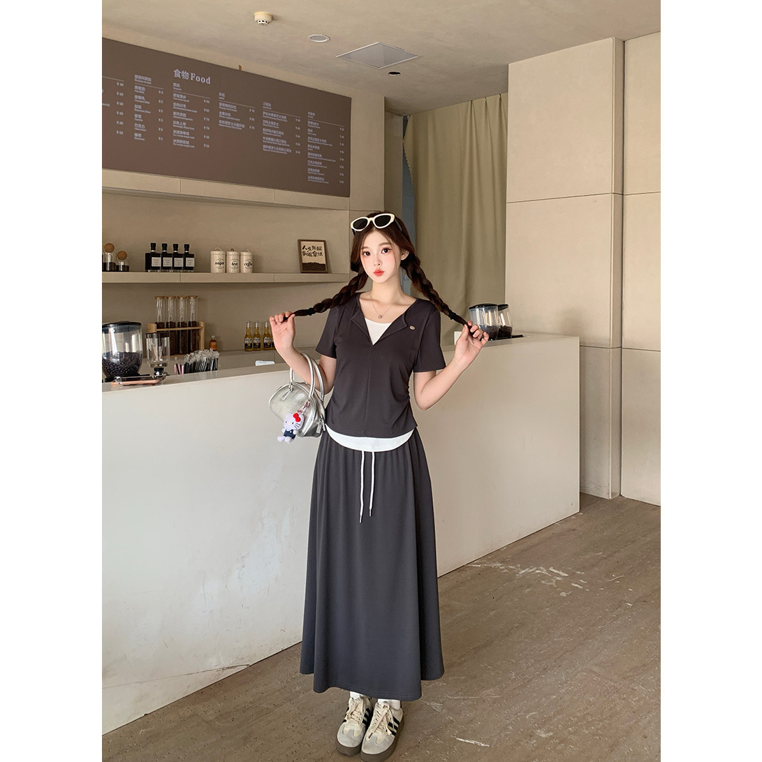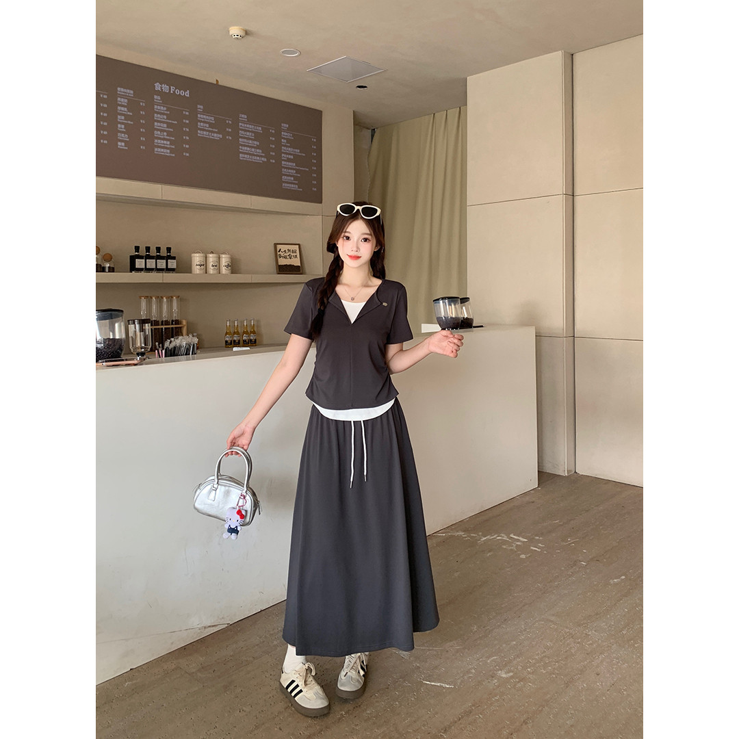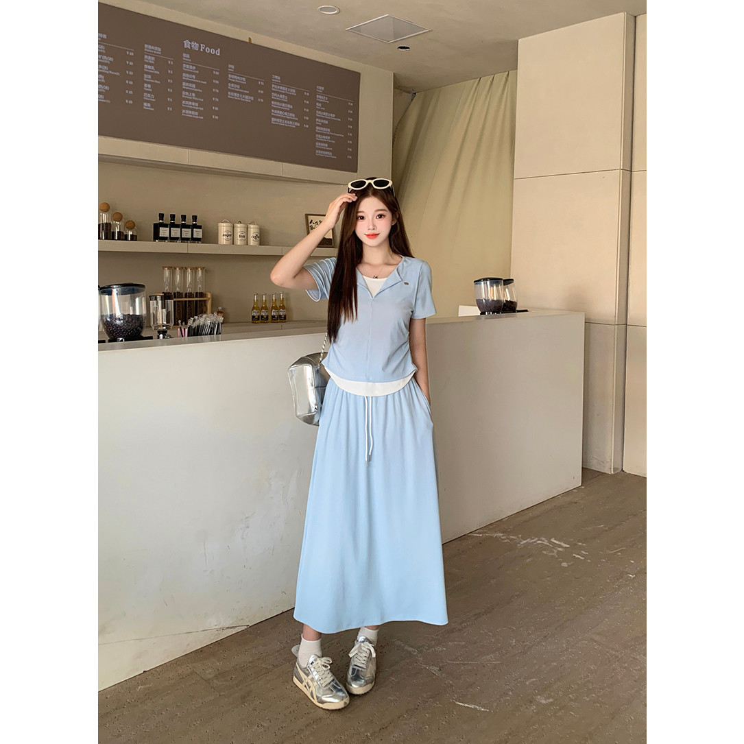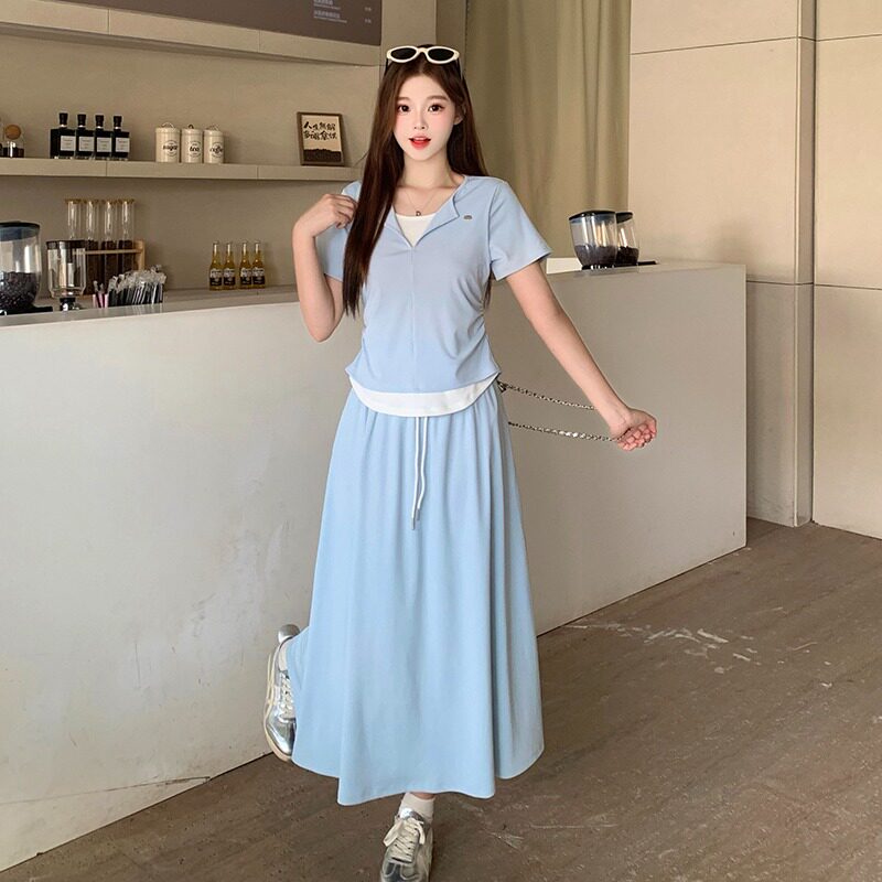 2026夏装新款胖mm大码女韩系显瘦休闲撞色拼接短袖T恤+半身裙套装