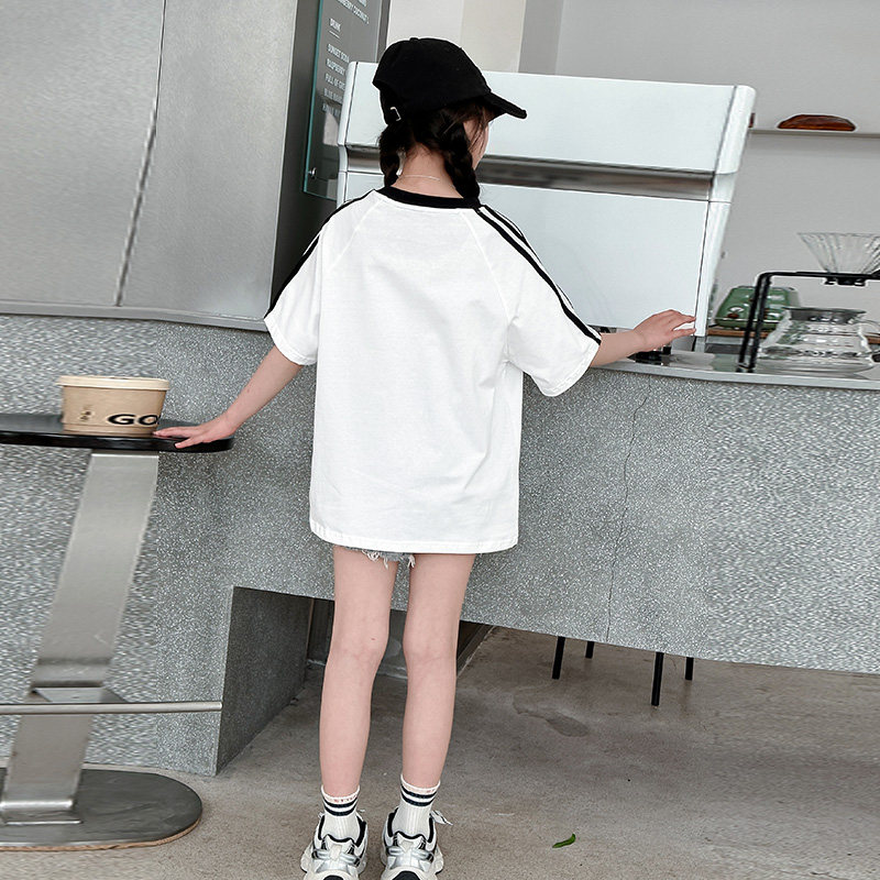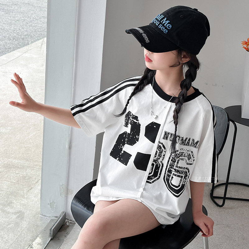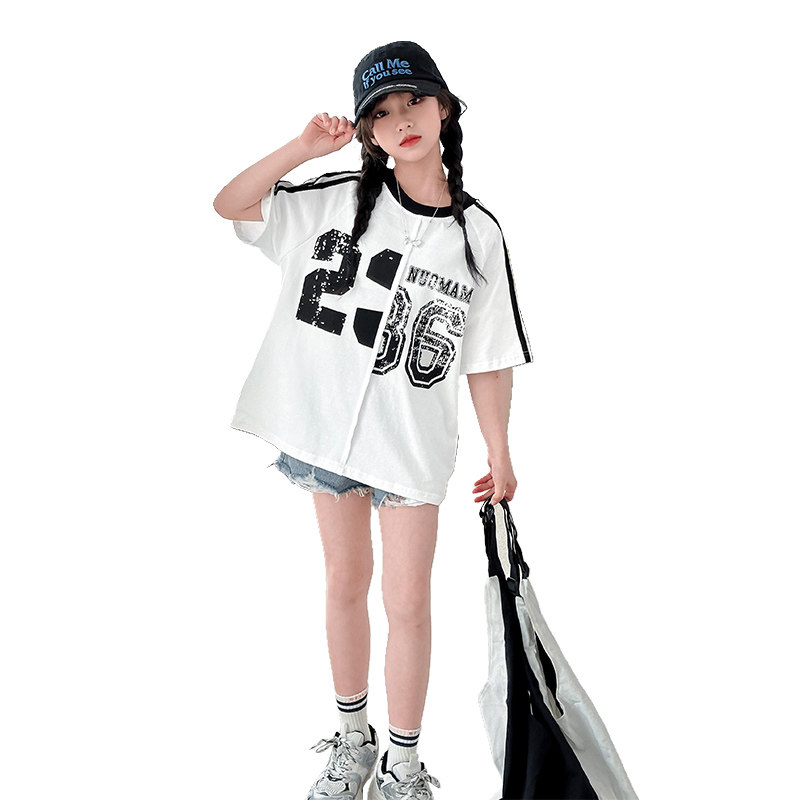 夏季女童短袖时尚潮酷宽松T恤圆领中长款嘻哈爵士跳舞上衣韩版潮