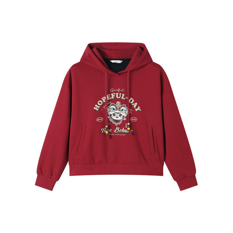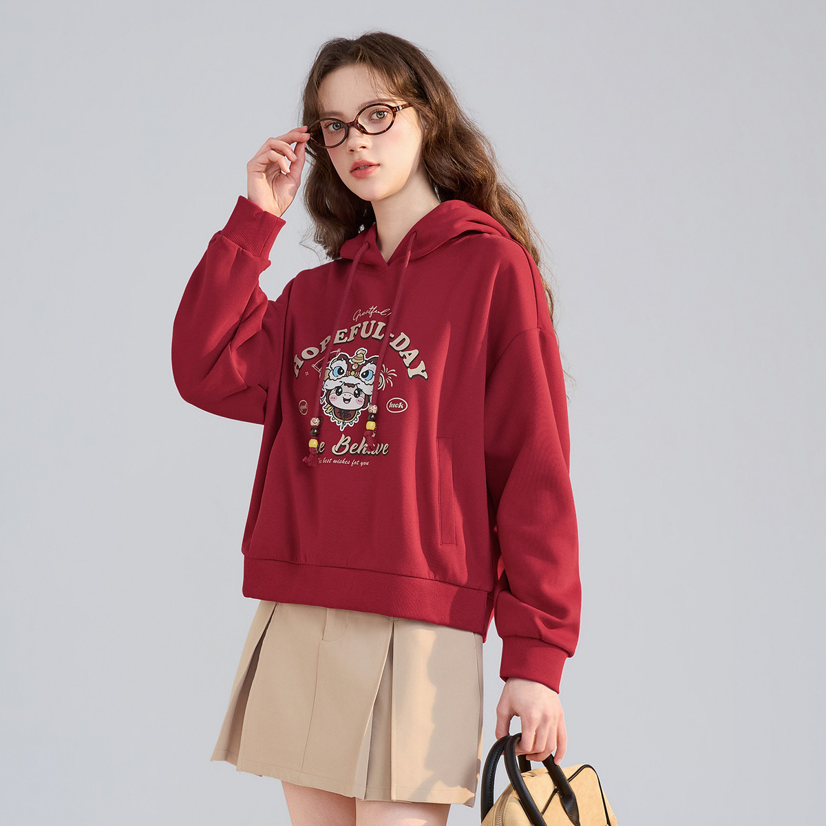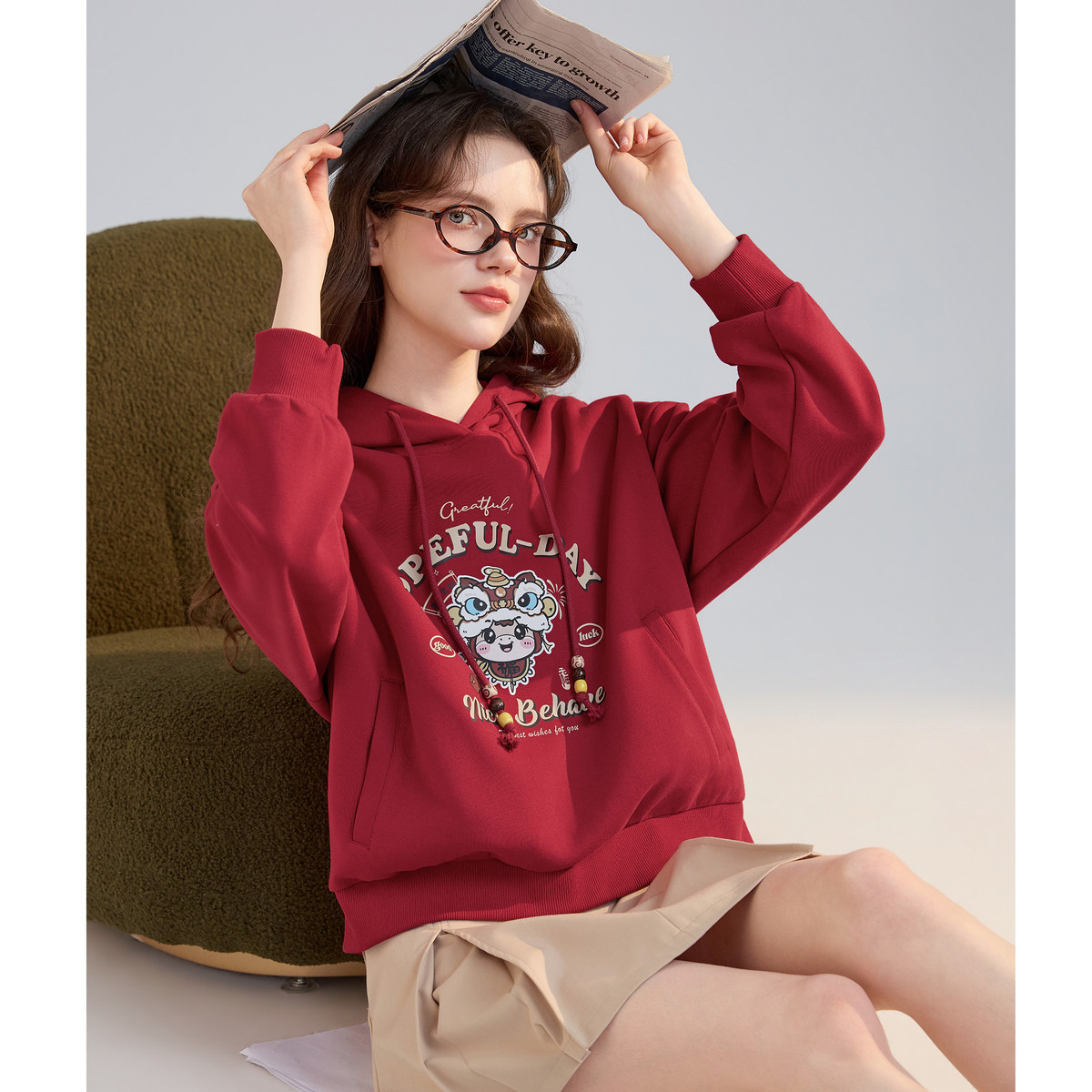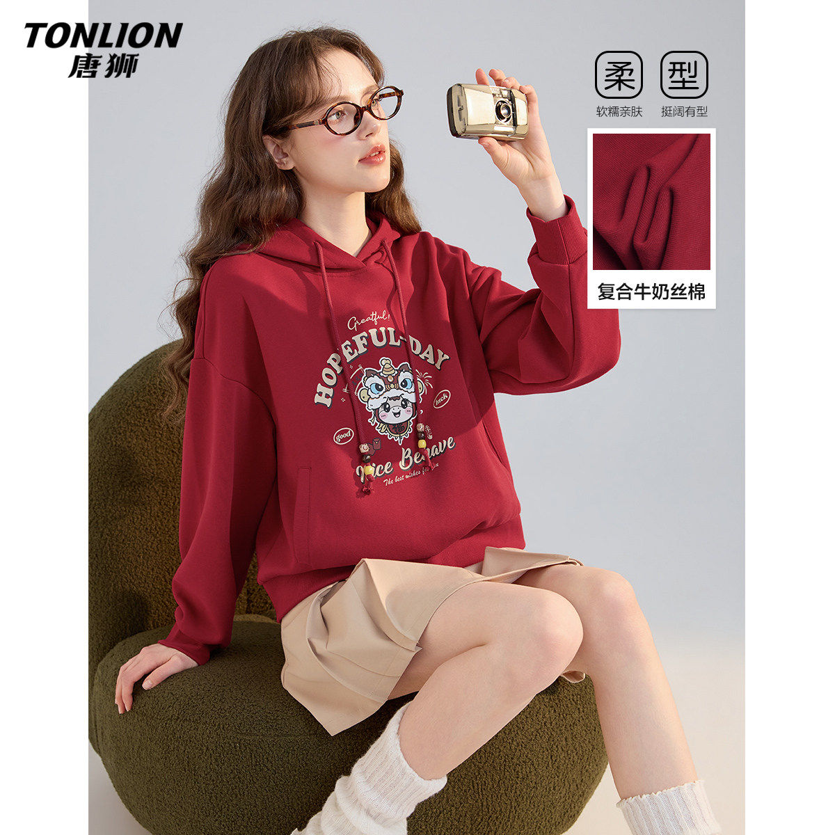 唐狮红色连帽卫衣女款2026新款春装洋气减龄卡通印花宽松套头上衣
