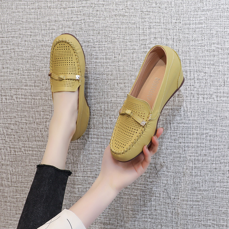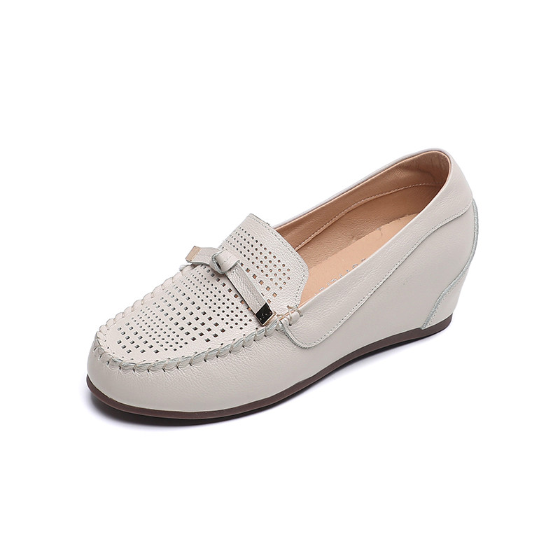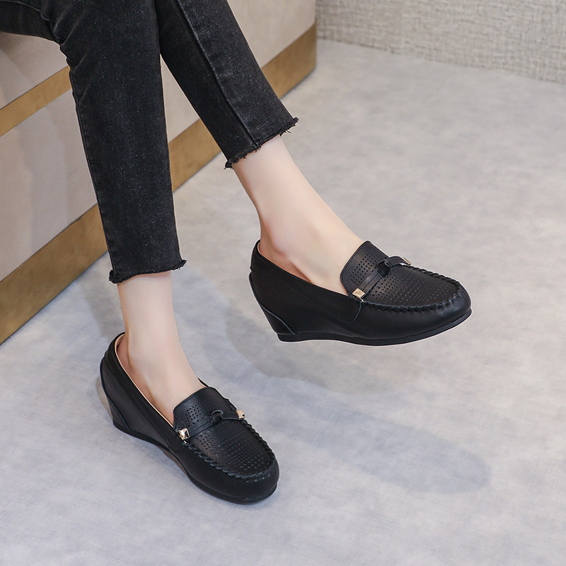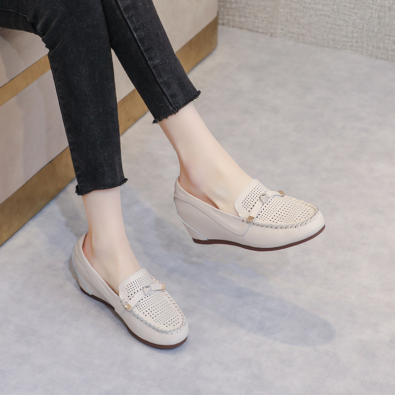 坡跟单鞋女2026夏款一脚蹬软底豆豆鞋真皮镂空透气休闲内增高女鞋