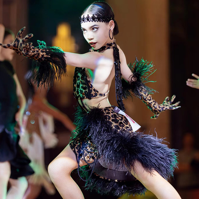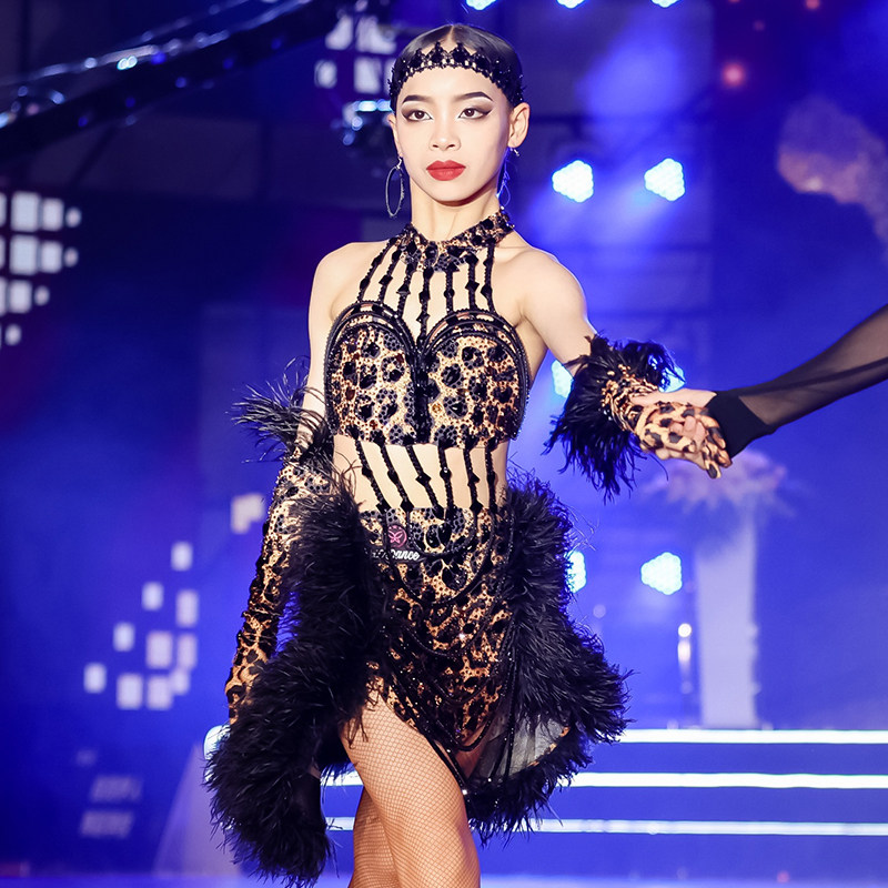 星辰舞服拉丁舞比赛花服气质全场吸睛演出服高贵鸵鸟毛赛场焦点款