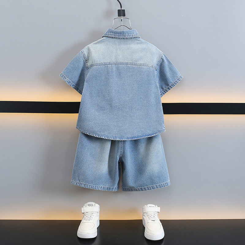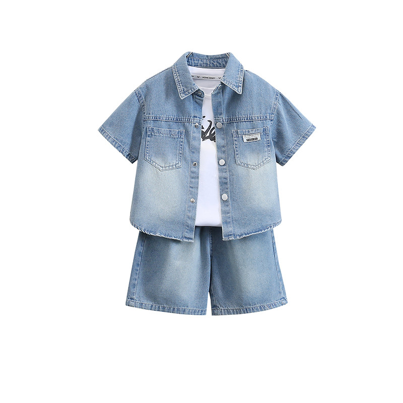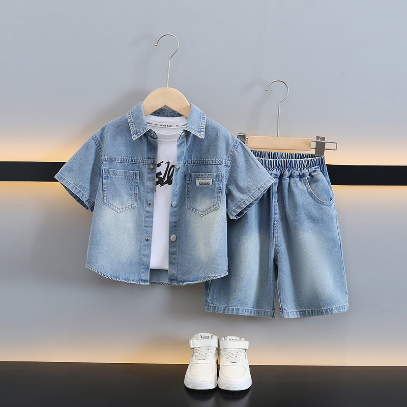 儿童夏装短袖牛仔衬衫三件套2026新款宝宝薄款衣服潮男童夏季套装