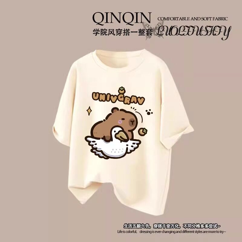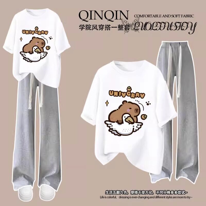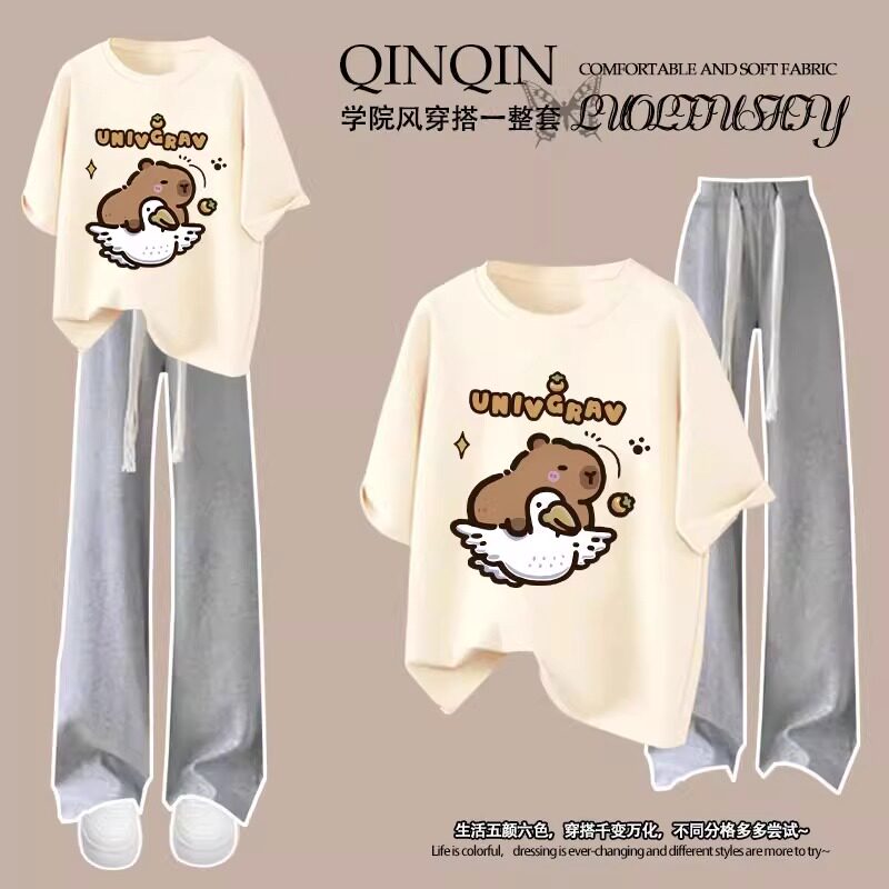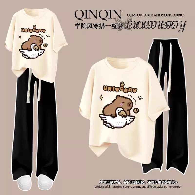 2025夏季新款女童纯棉短袖T恤套装卡皮巴拉洋气女大童长裤两件套