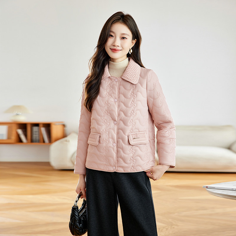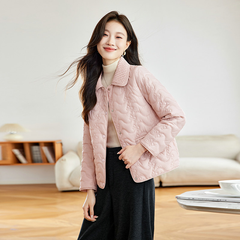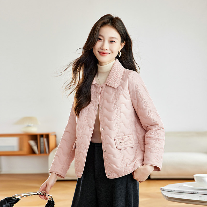粉色短款棉服女款2026新款轻薄时尚设计感翻领刺绣小香风夹棉外套