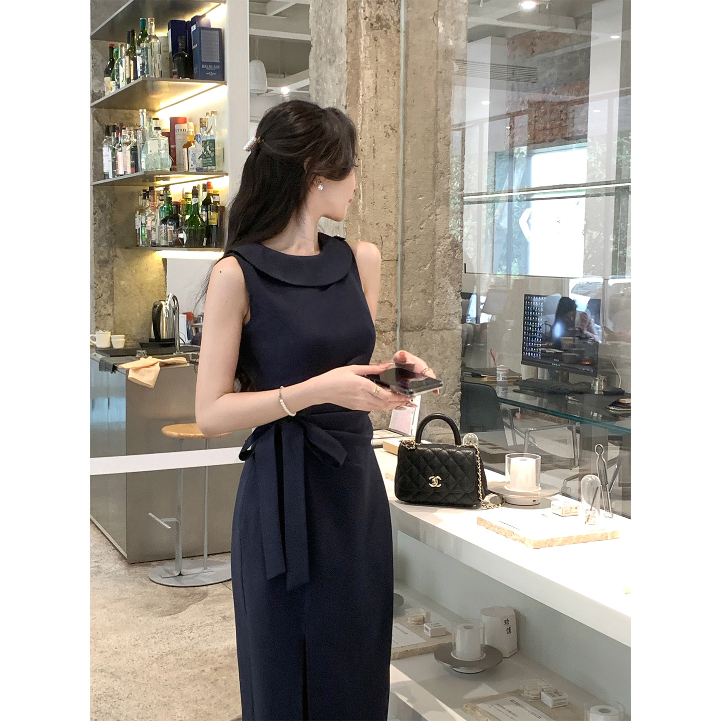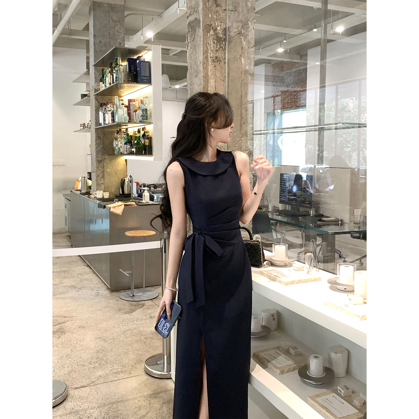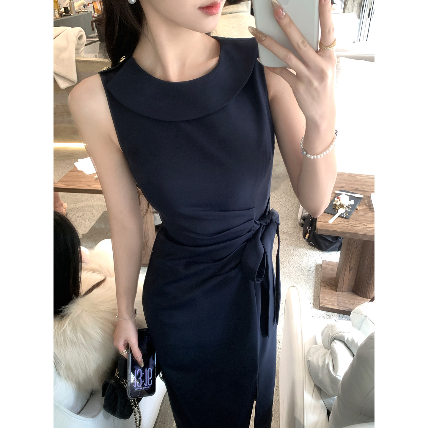 韩语琳 法式优雅气质藏青色无袖连衣裙2026收腰设计感开叉中长裙