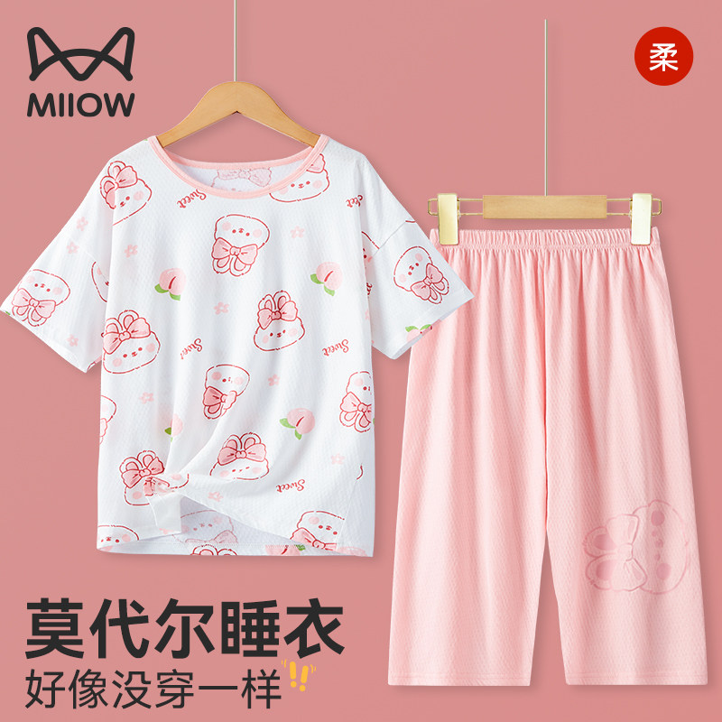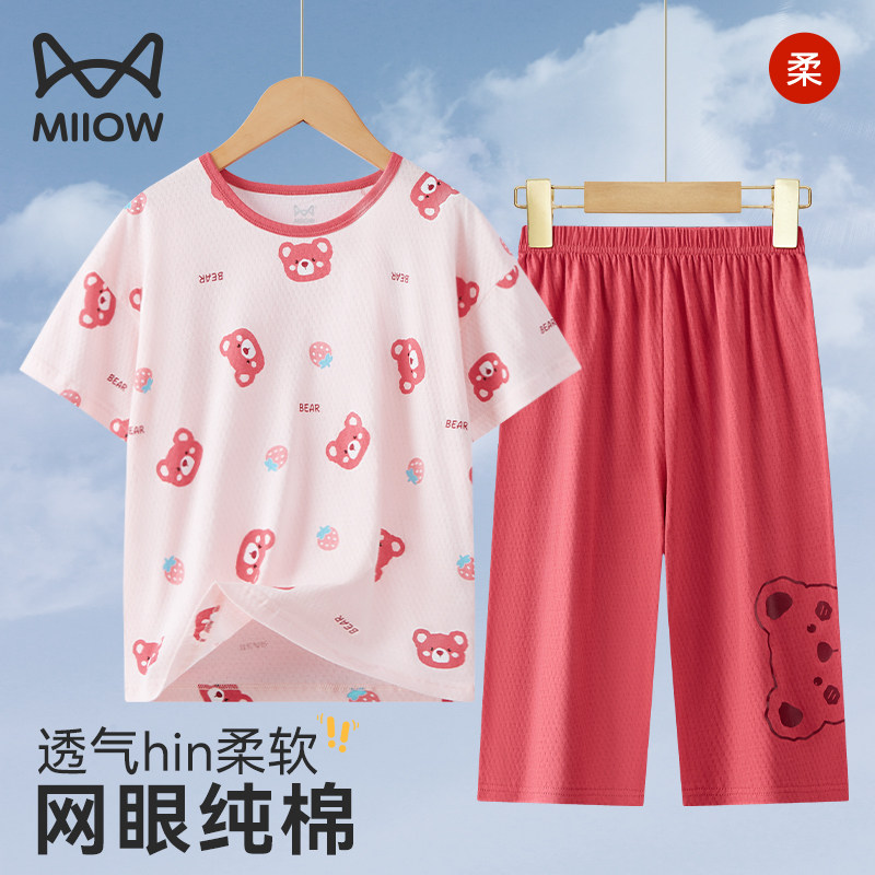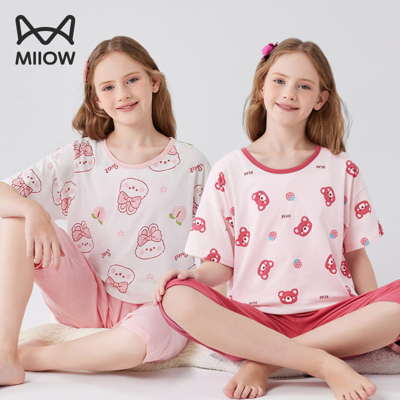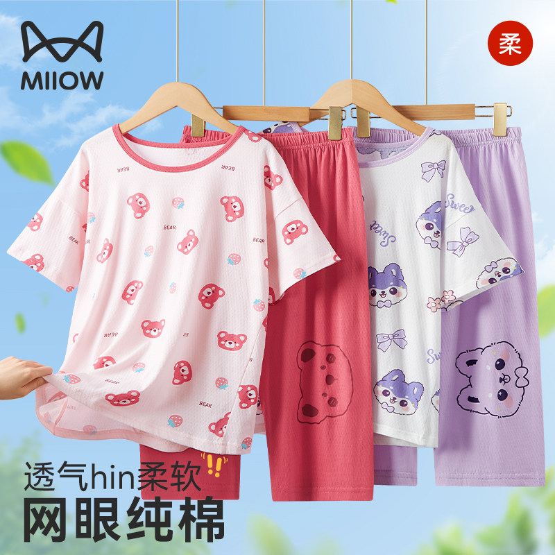 猫人女大童睡衣儿童全纯棉短袖女孩青少年2026夏天新款网眼家居服