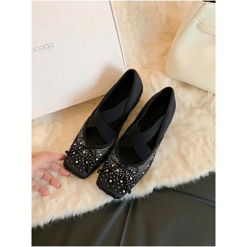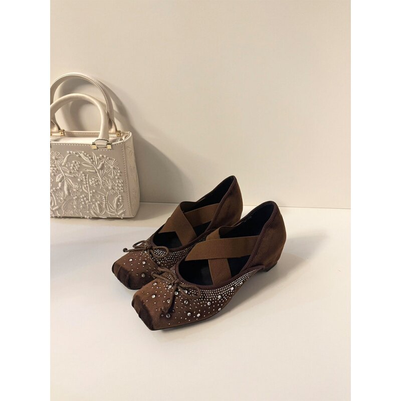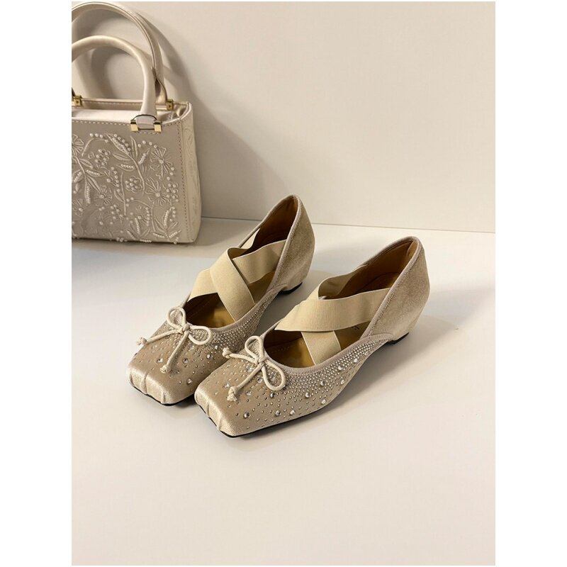 法式复古芭蕾鞋女交叉带方头新款内增高玛丽珍鞋女水钻蝴蝶结单鞋
