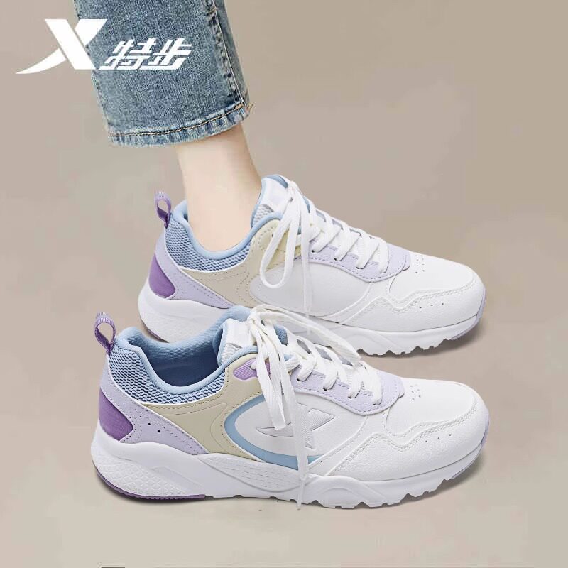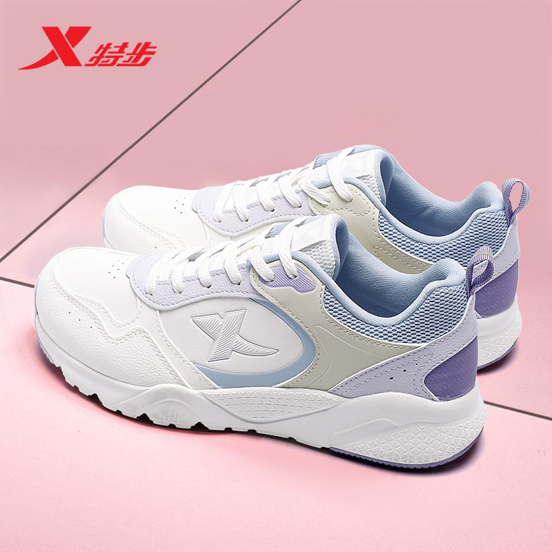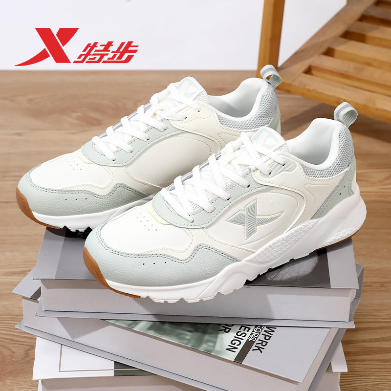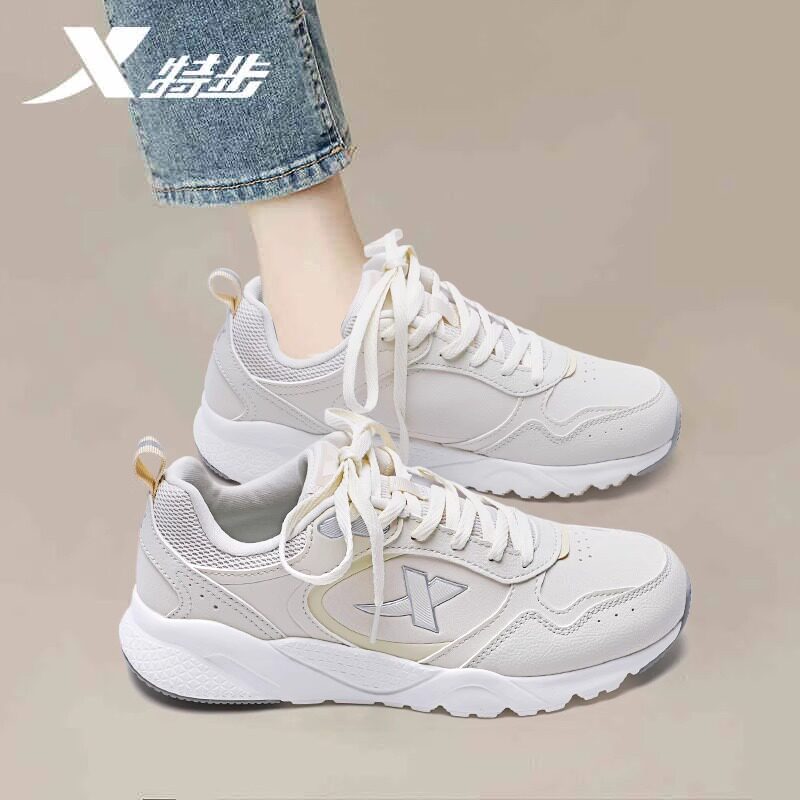 特步女鞋跑步鞋春季网面鞋子老爹鞋小白鞋休闲皮面防水运动鞋女款