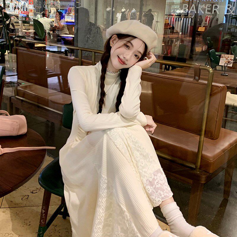 白色高领针织f鱼尾连衣裙女秋冬配大衣内搭打底浅色毛衣长裙小个