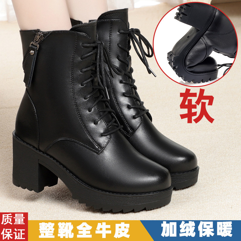 真皮马丁靴女款冬季加绒短靴新款厚底高跟全牛皮女靴加厚羊毛棉鞋