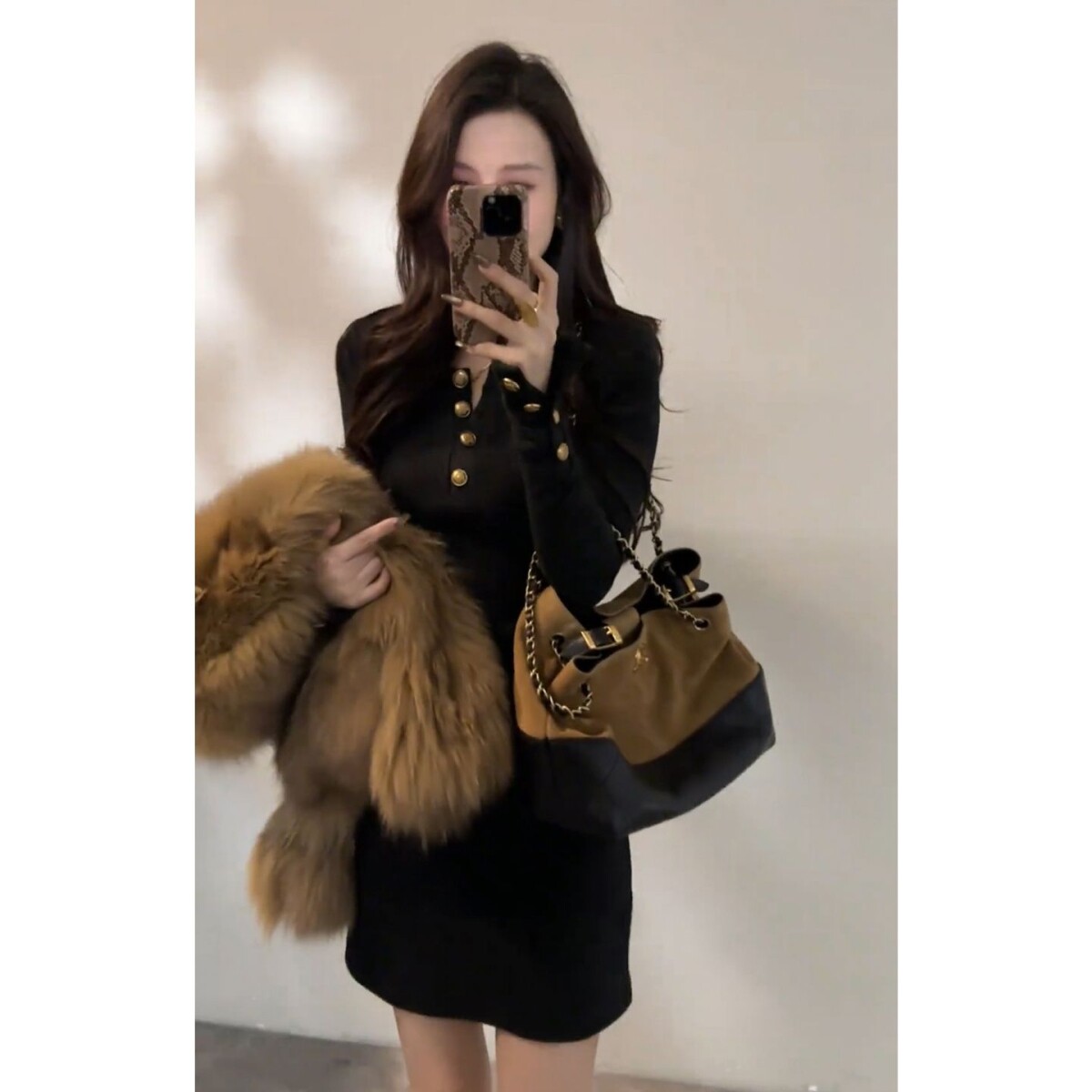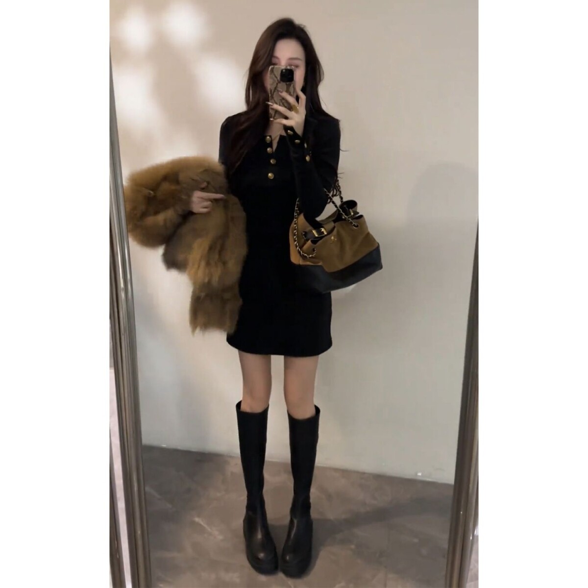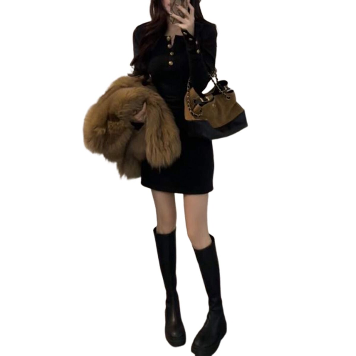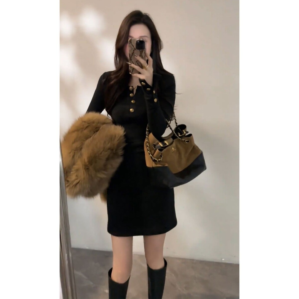 法式复古黑色长袖v领连衣裙子女2025秋冬季大衣内搭辣妹包臀短裙