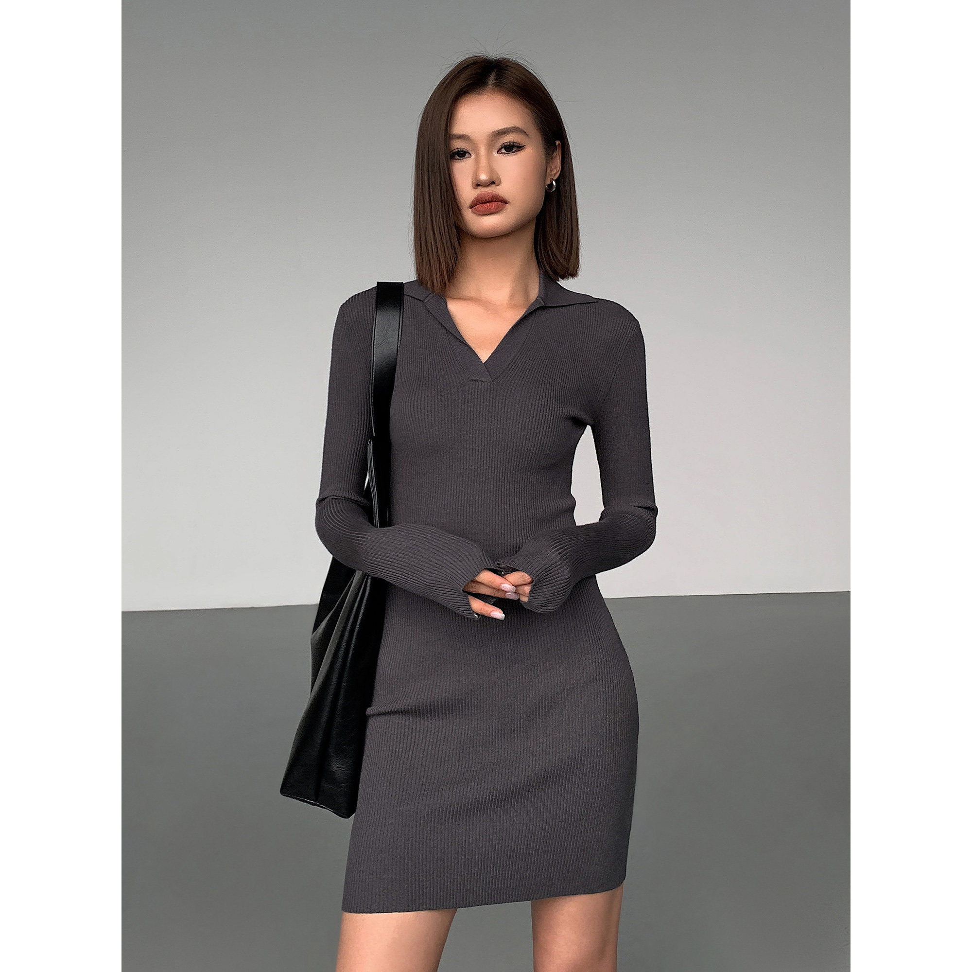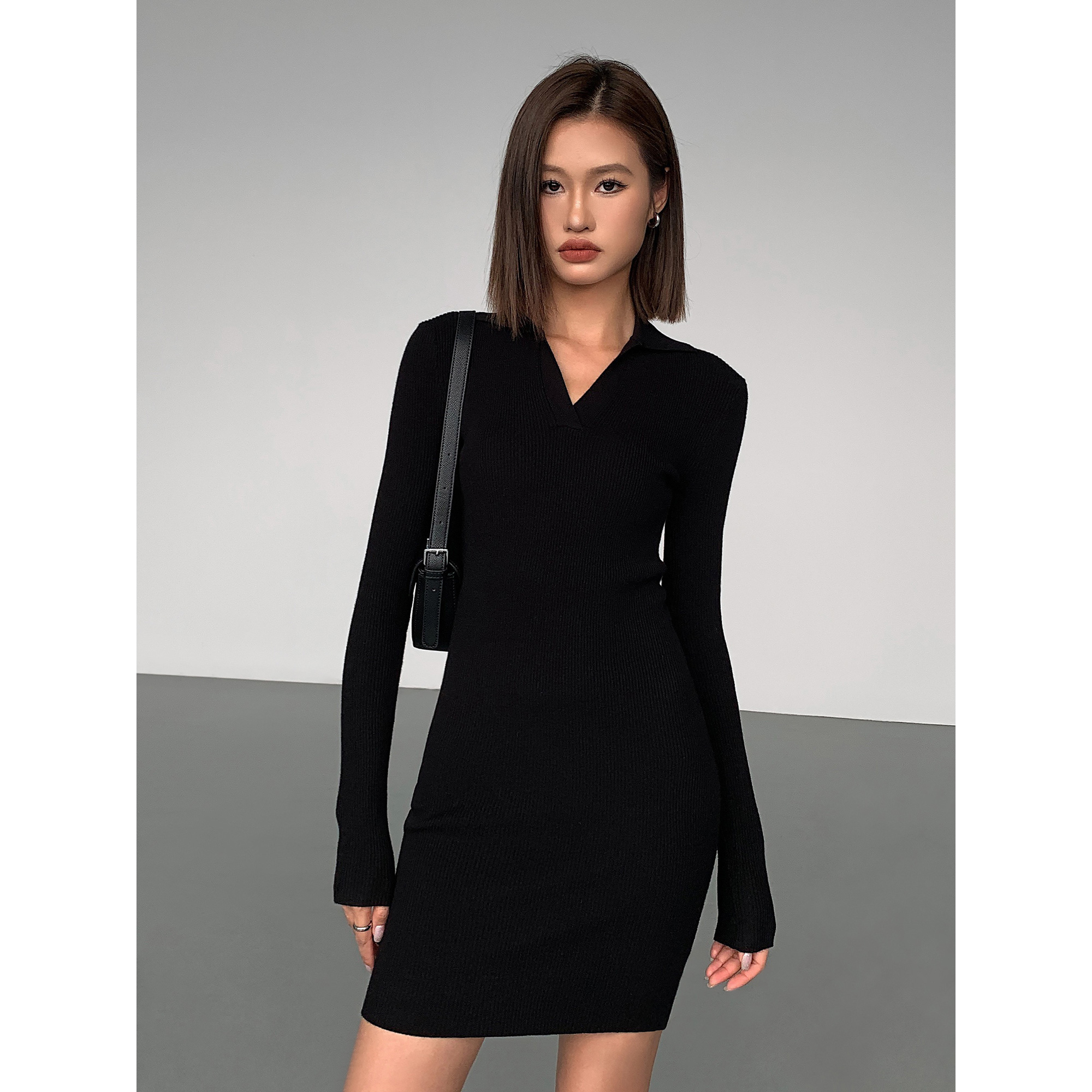 ousph 黑色翻V领修身显瘦长袖连衣裙女秋季内搭纯欲包臀短裙