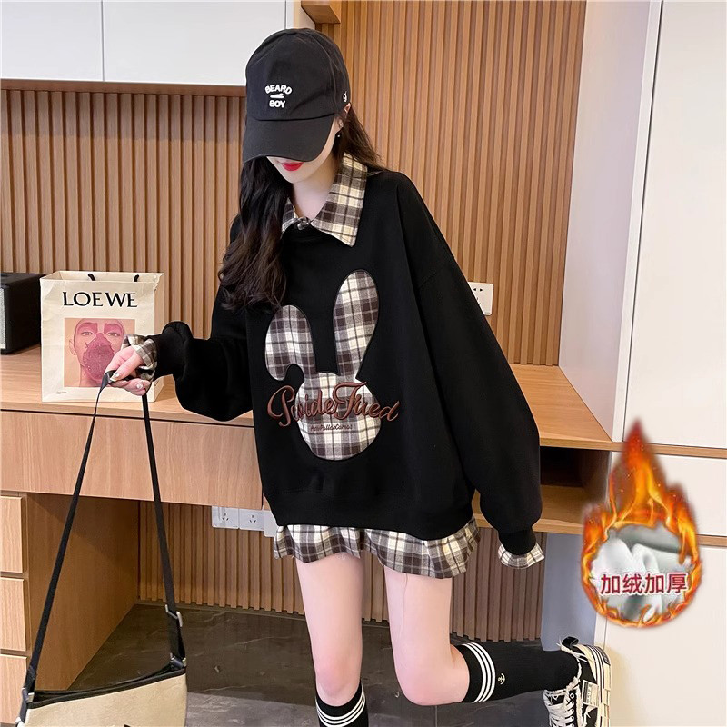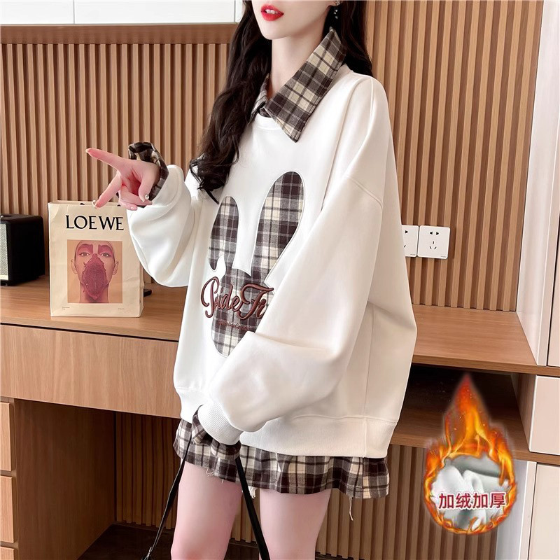 高中生秋冬加绒加厚翻领卫衣女宽松初中学生假两件贝贝绒上衣外套