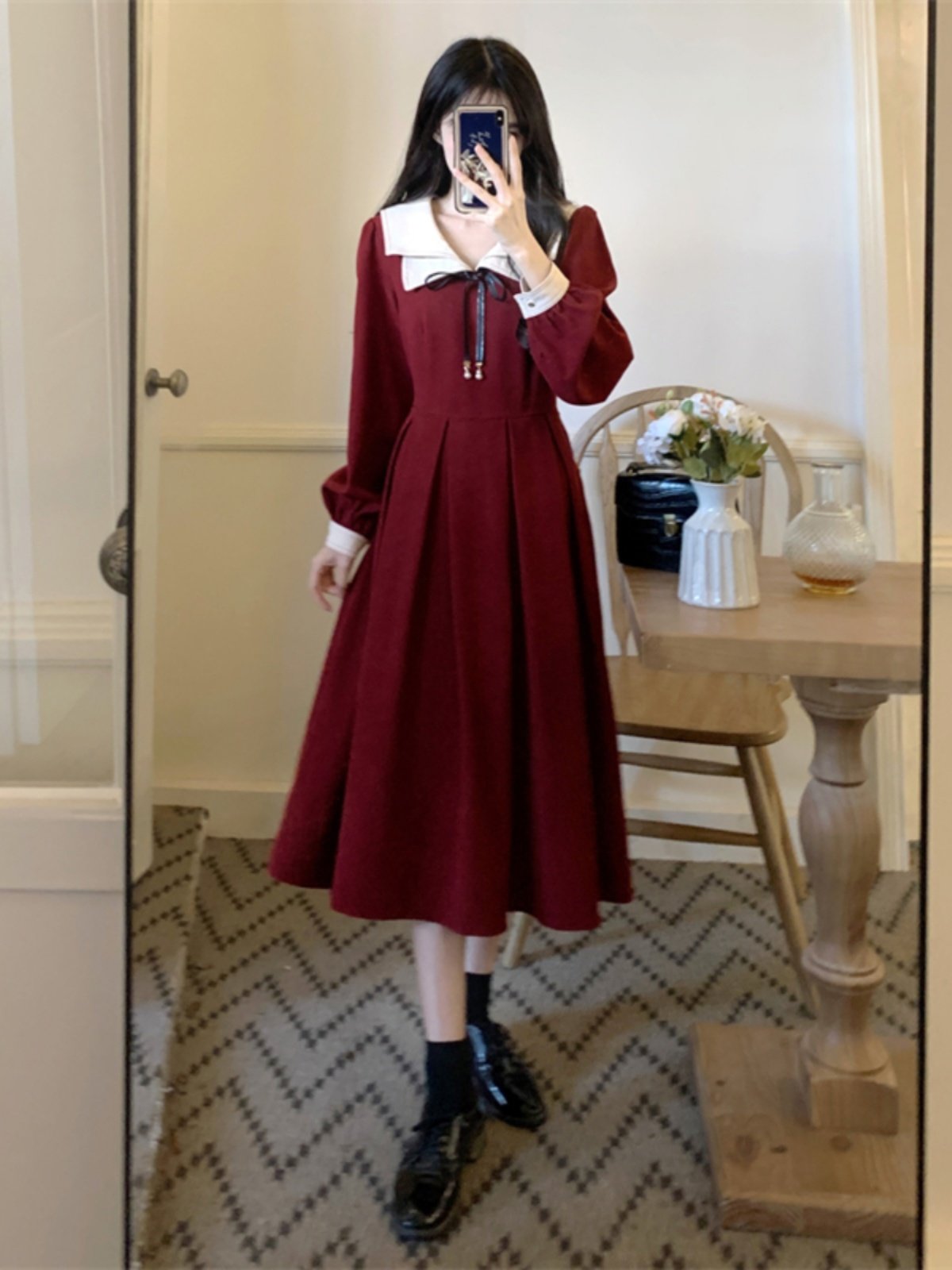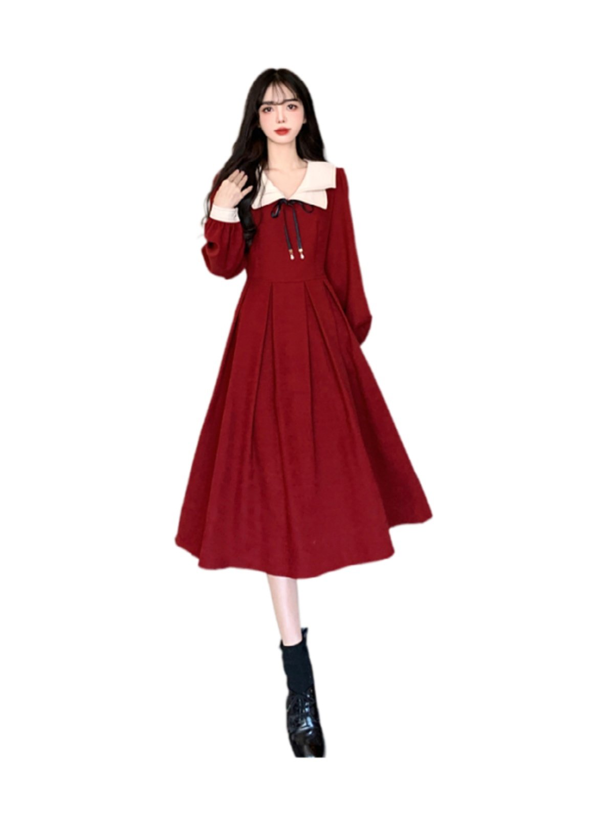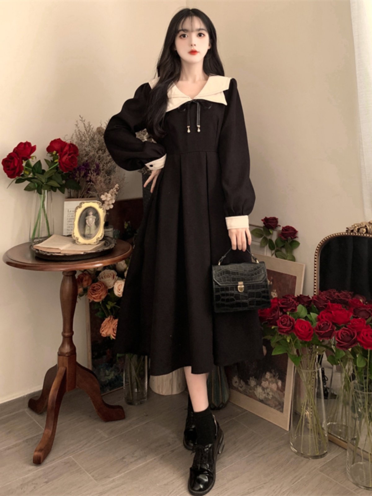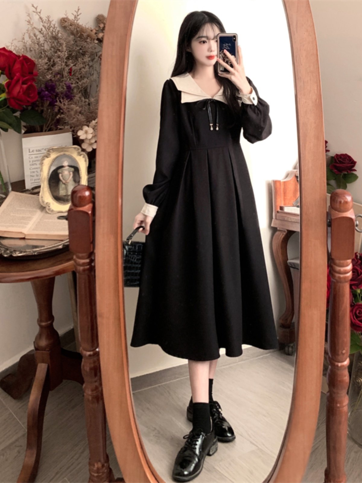 大码设计感长袖裙子女秋季2025新款减龄收腰法式赫本风复古连衣裙