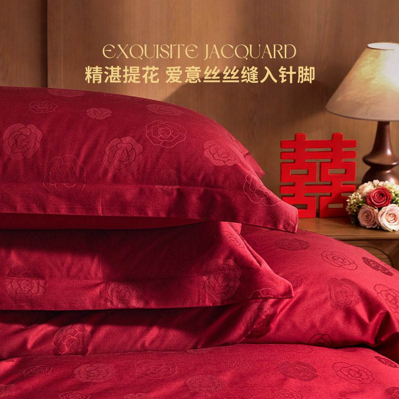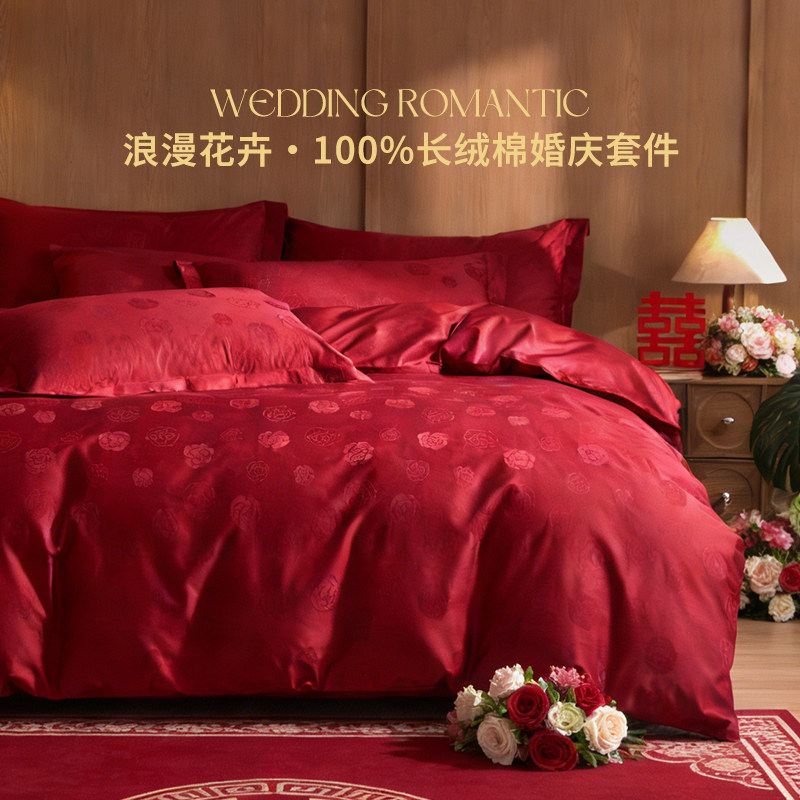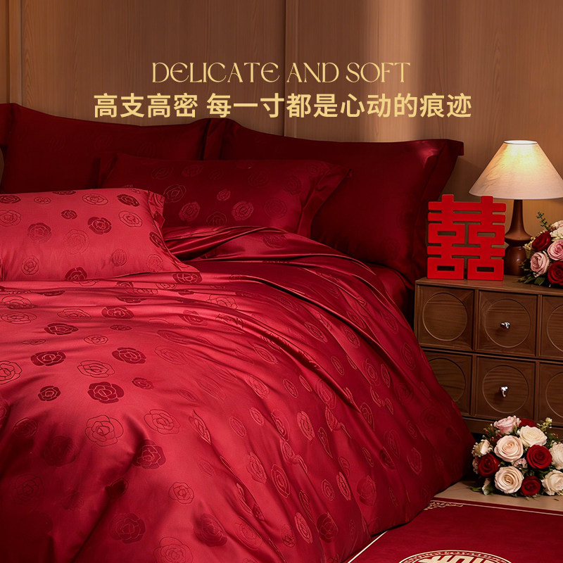 新款60支长绒棉结婚四件套轻奢高级感主卧室红色提花喜庆床上用品