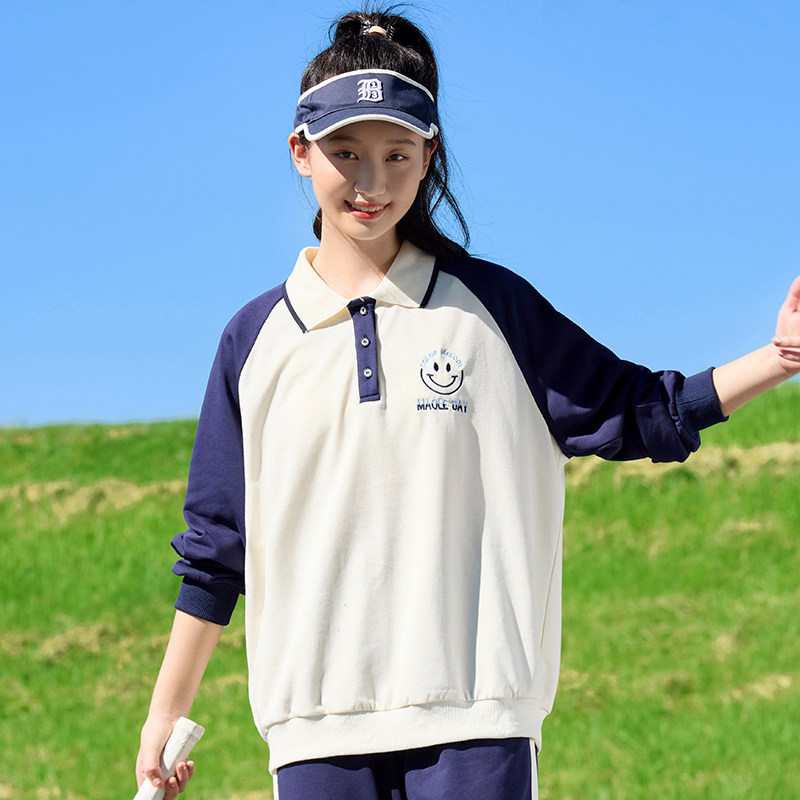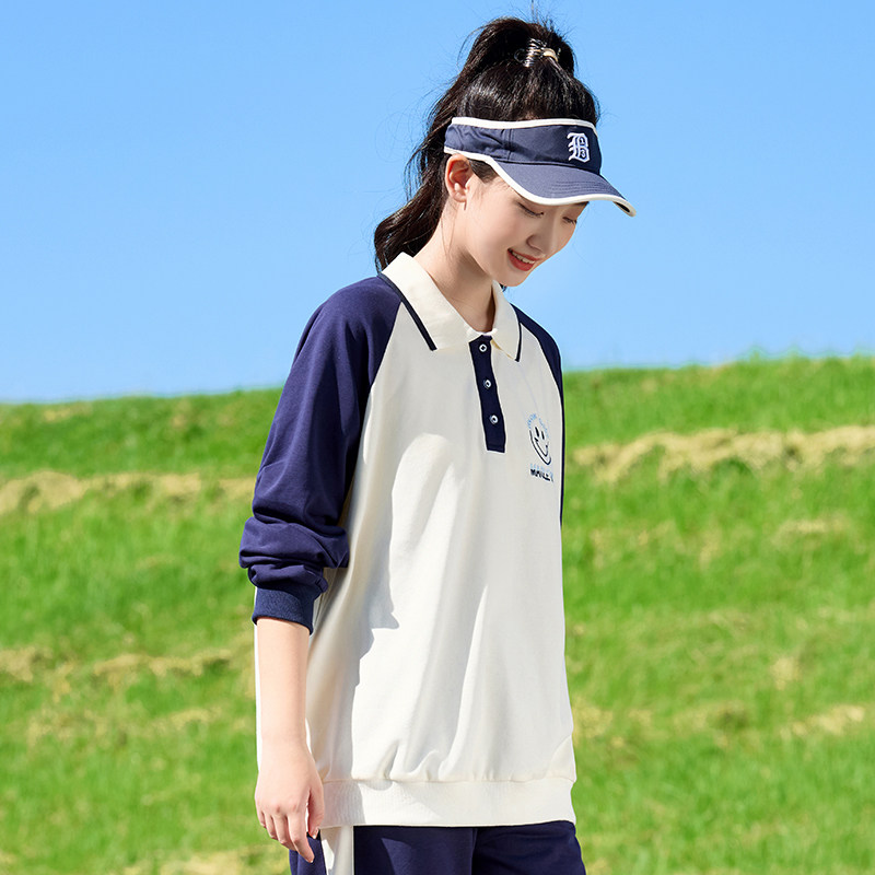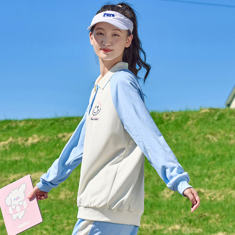 311线报网描述:卫衣春装薄款套装撞色Polo领女孩初中学生女