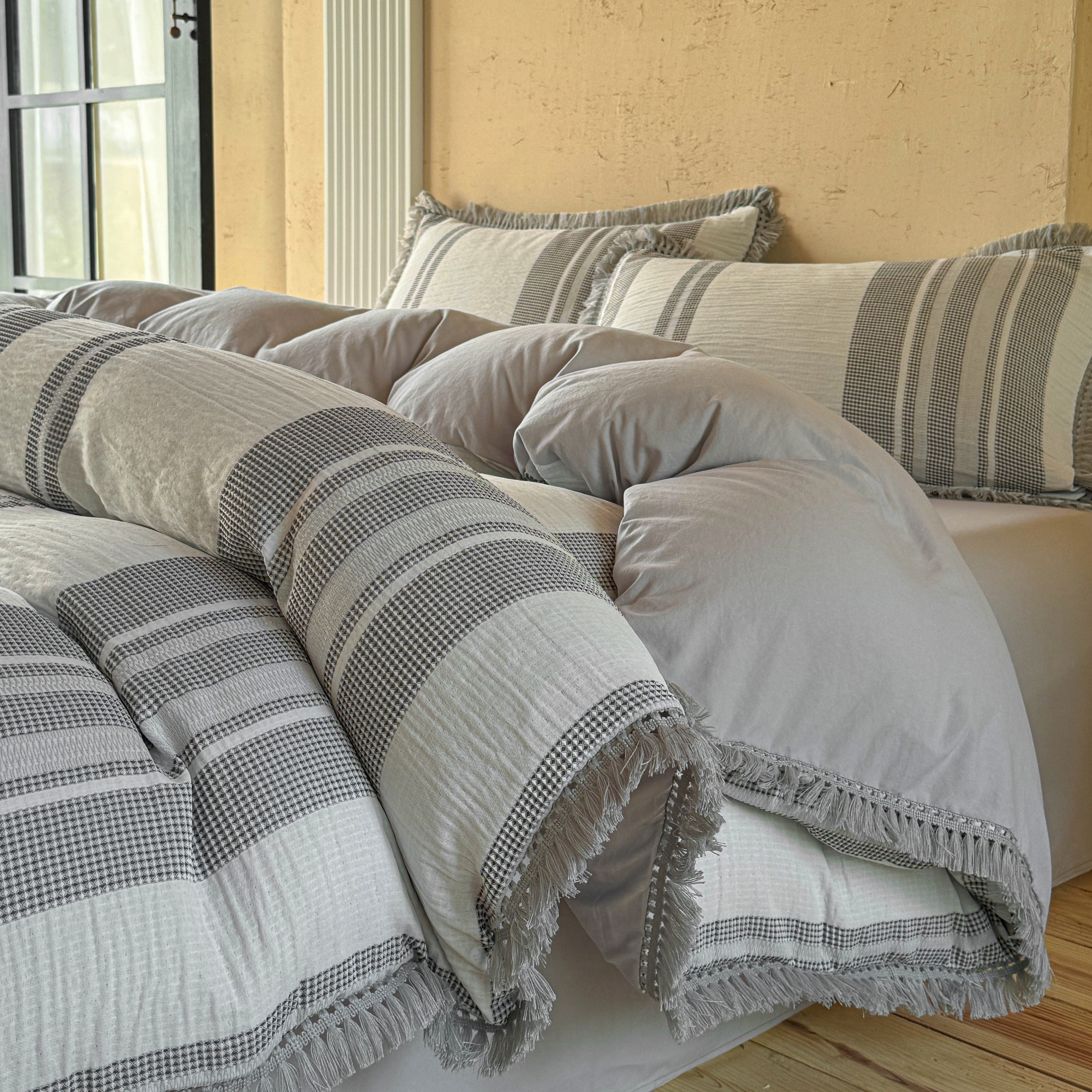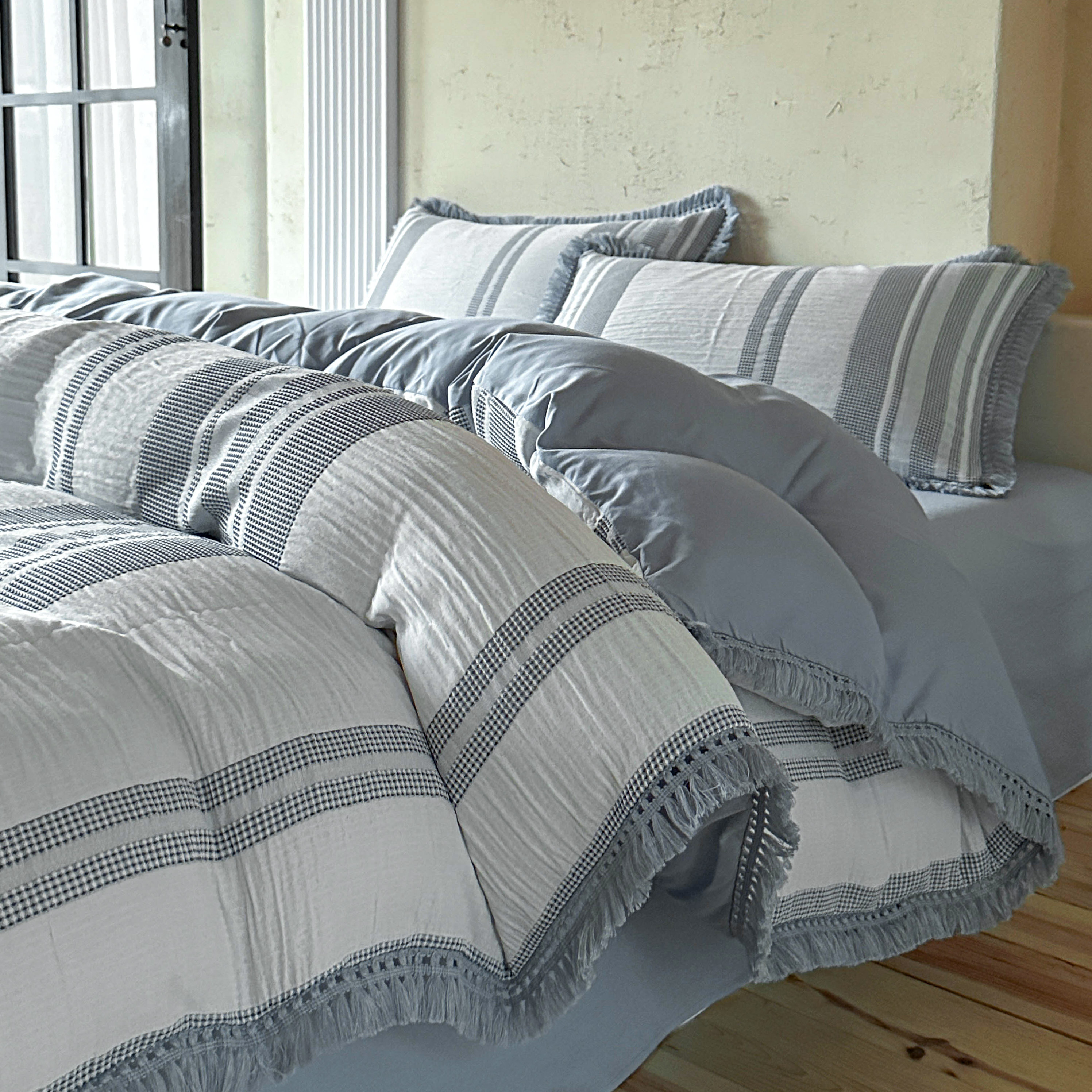 法式2026新款色织提花双层纱华夫格流苏四件套纯棉纯色白床上用品