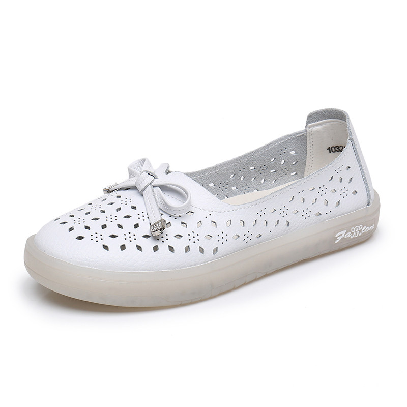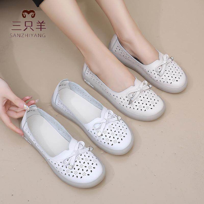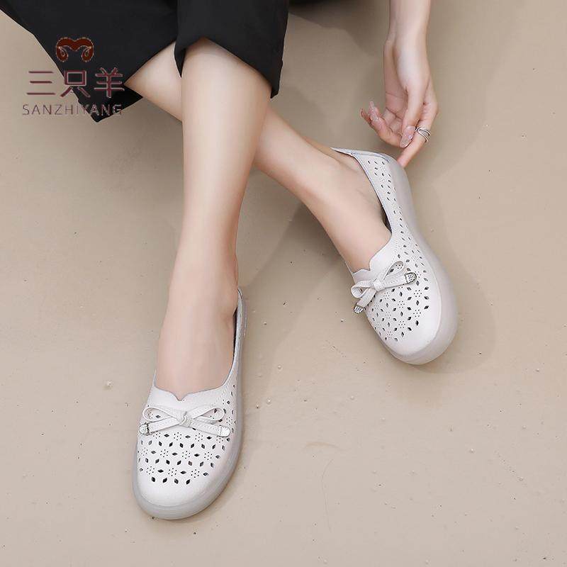 三只羊女软底洞洞不累脚春夏透气浅口牛筋底真皮舒适妈妈鞋工作鞋