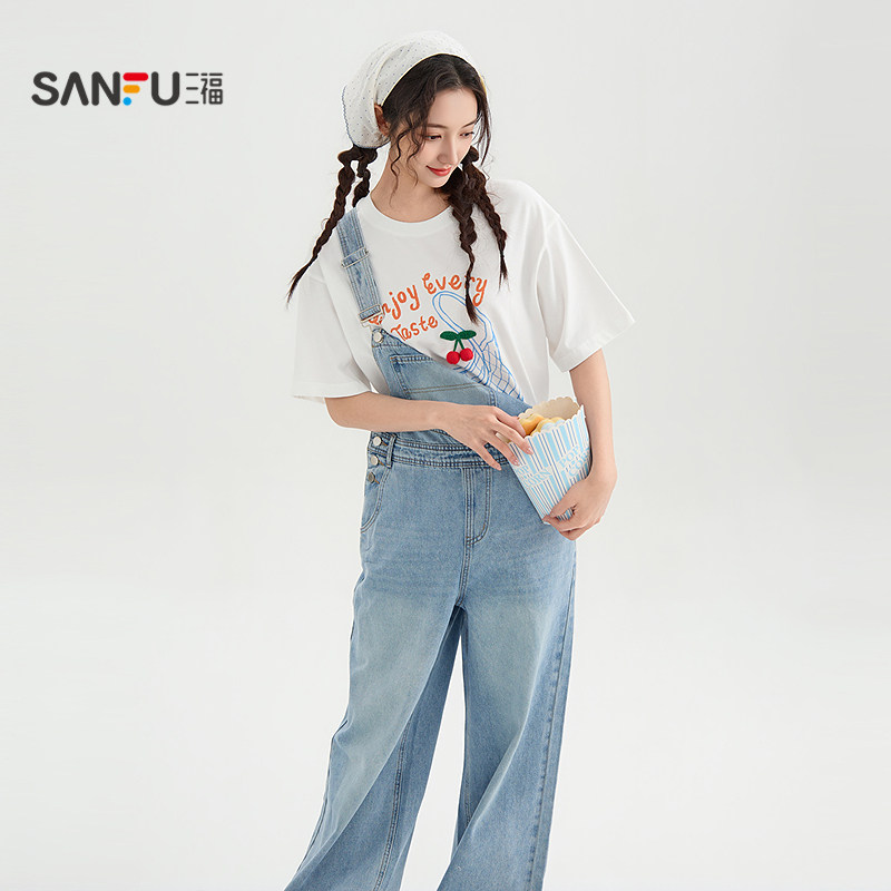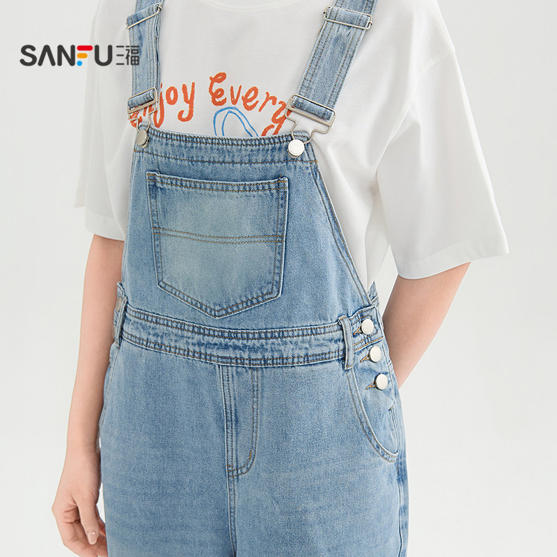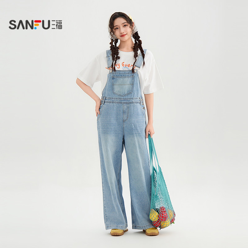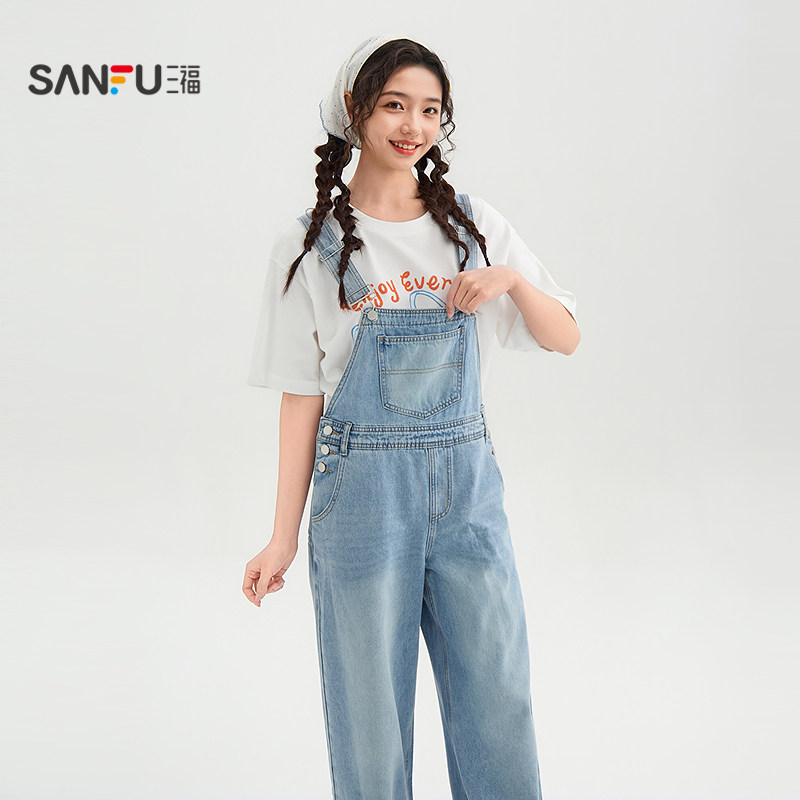 三福牛仔背带裤2026新款夏季胸前洗水口袋休闲连身裤子女装521291