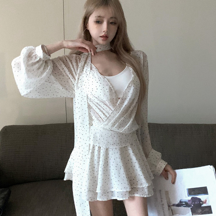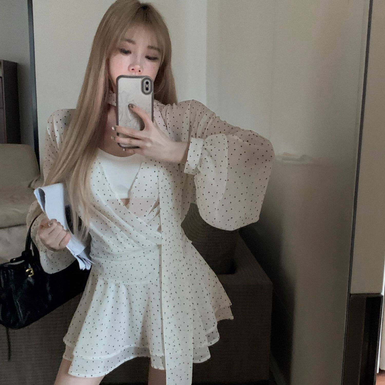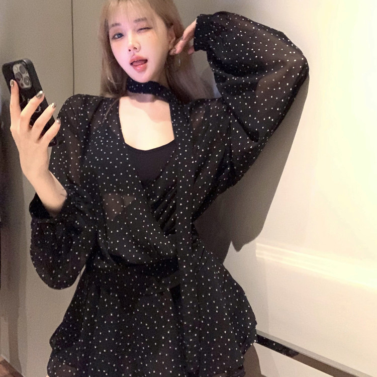 法式波点v领长袖雪纺连衣裙女夏季大码胖mm设计感别致收腰a字短裙