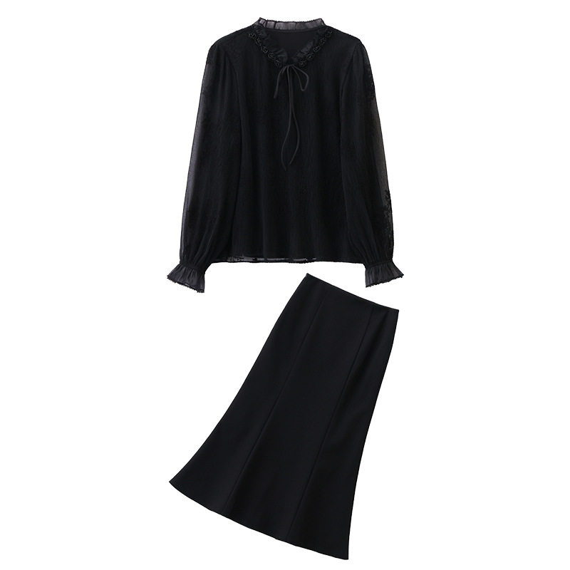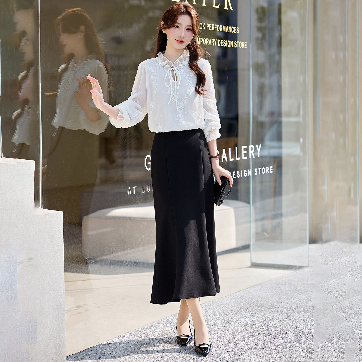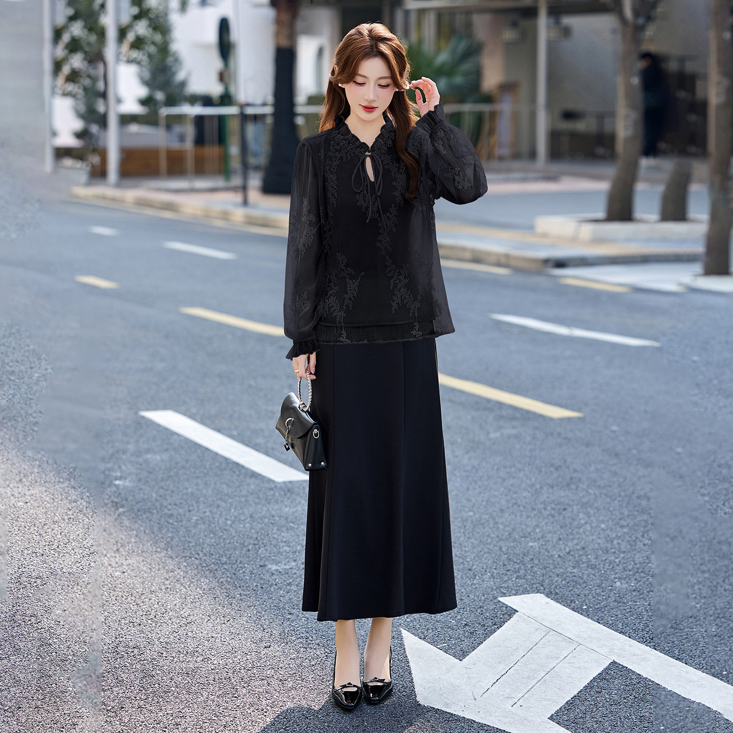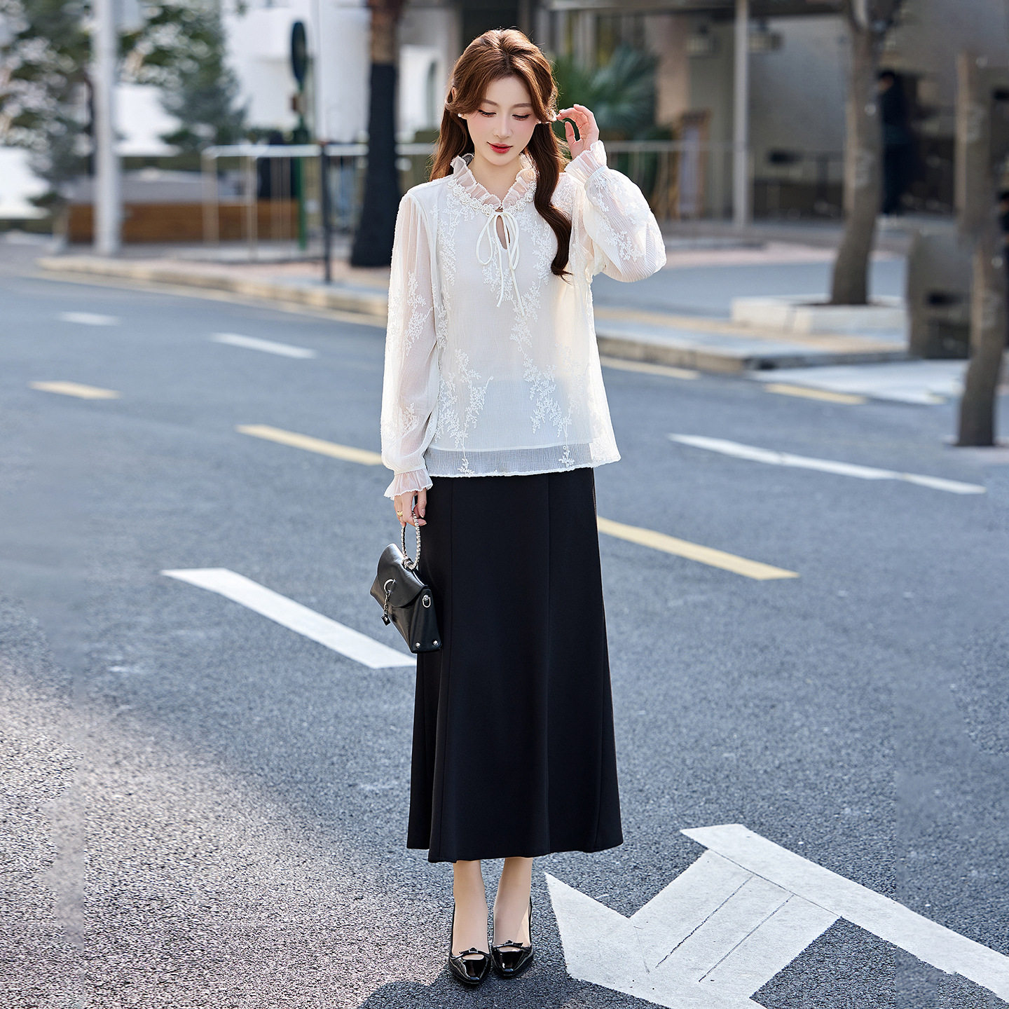 时尚套装2026春季新款女装刺绣气质木耳领衬衫半身裙两件套裙潮流