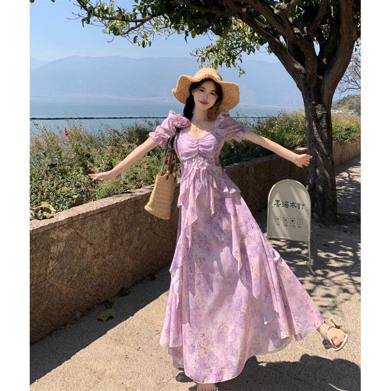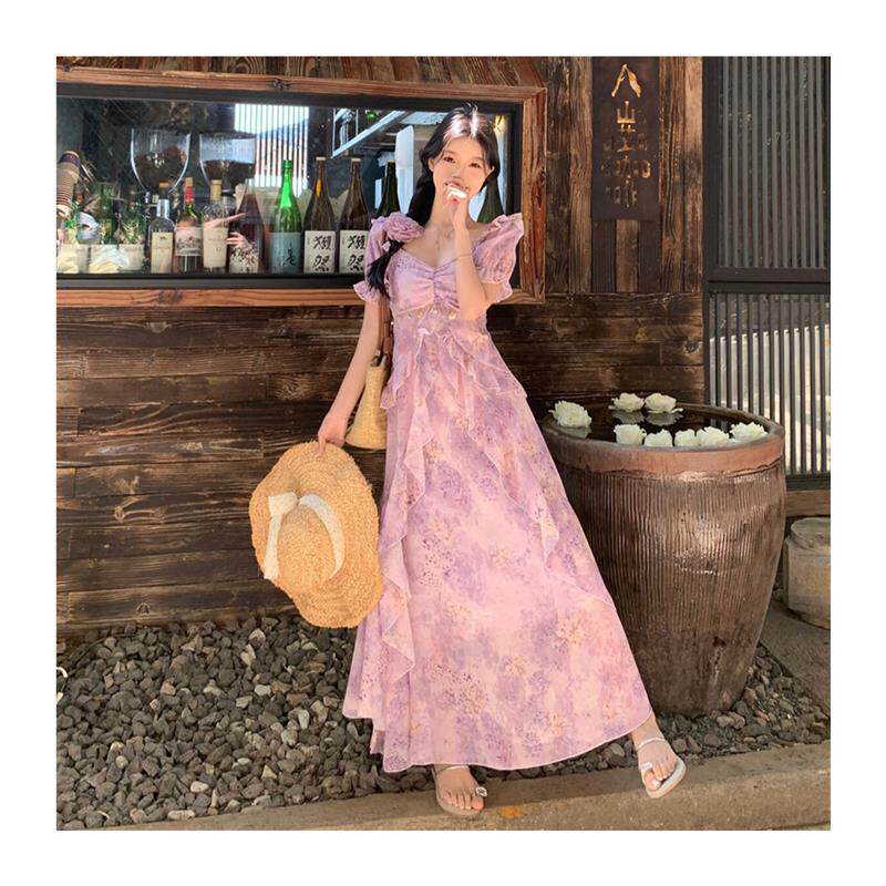 大码胖MM2025夏季飘逸雪纺渐变印花连衣裙海边度假风荷叶边裙子女