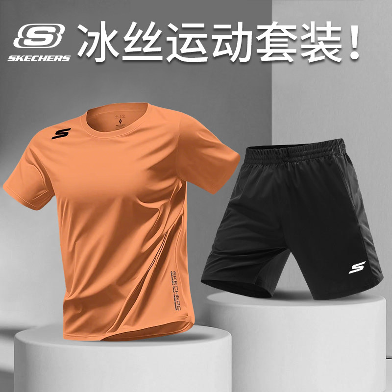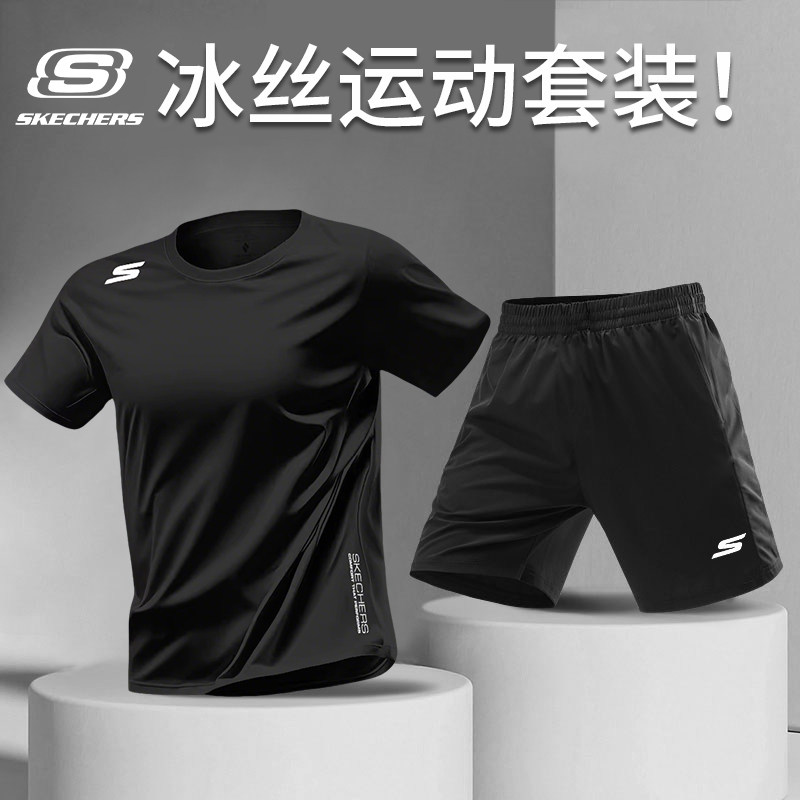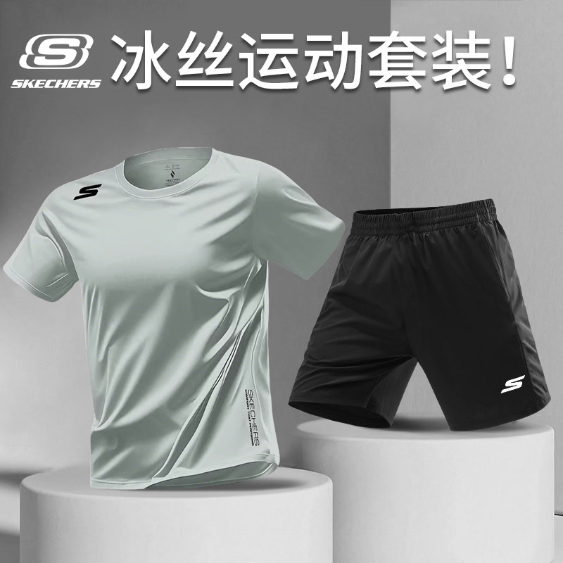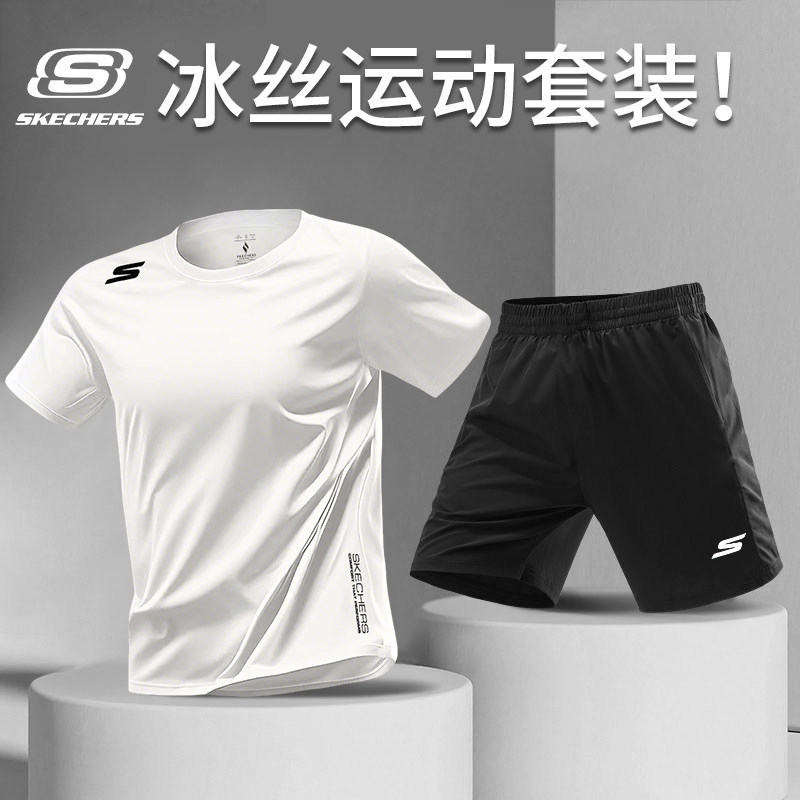 斯凯奇速干运动套装男士薄款透气短袖T恤短裤中考体测跑步两件套