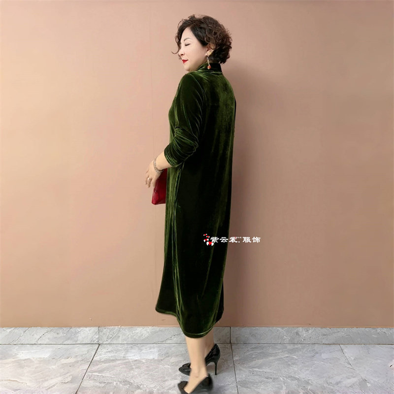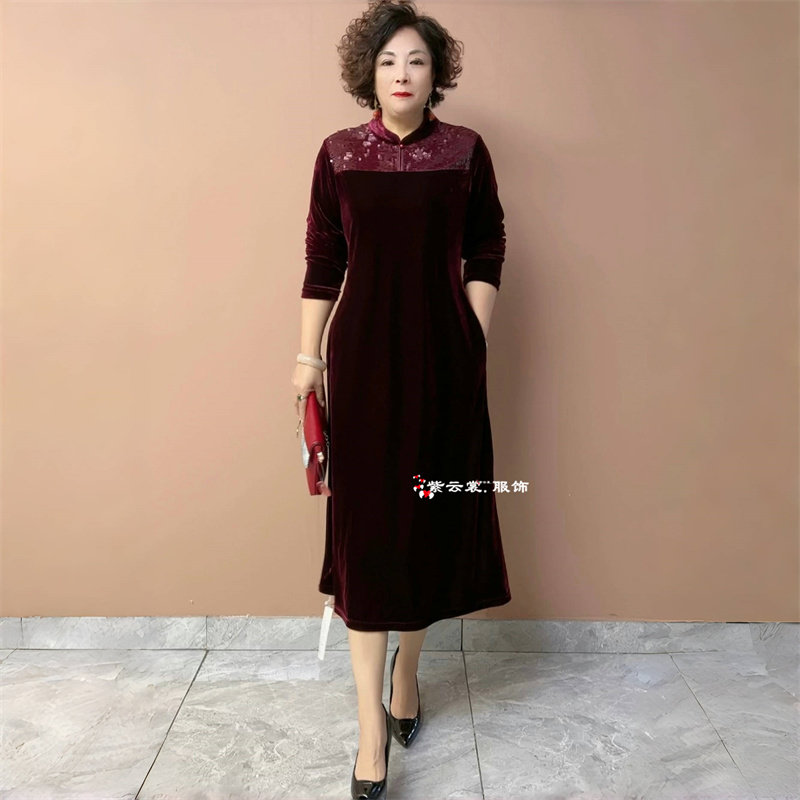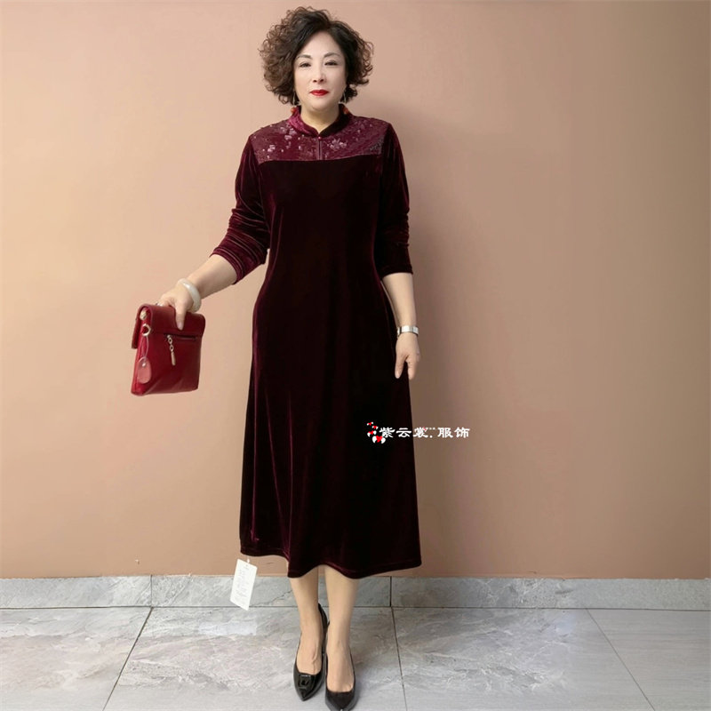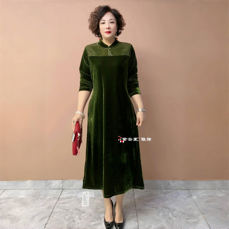秋冬高级感轻奢丝绒连衣裙长袖气质中老年妈妈装宽松遮肉大码长裙