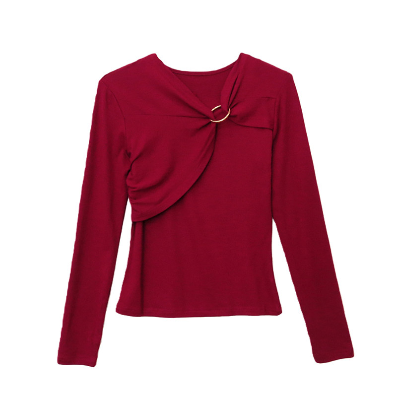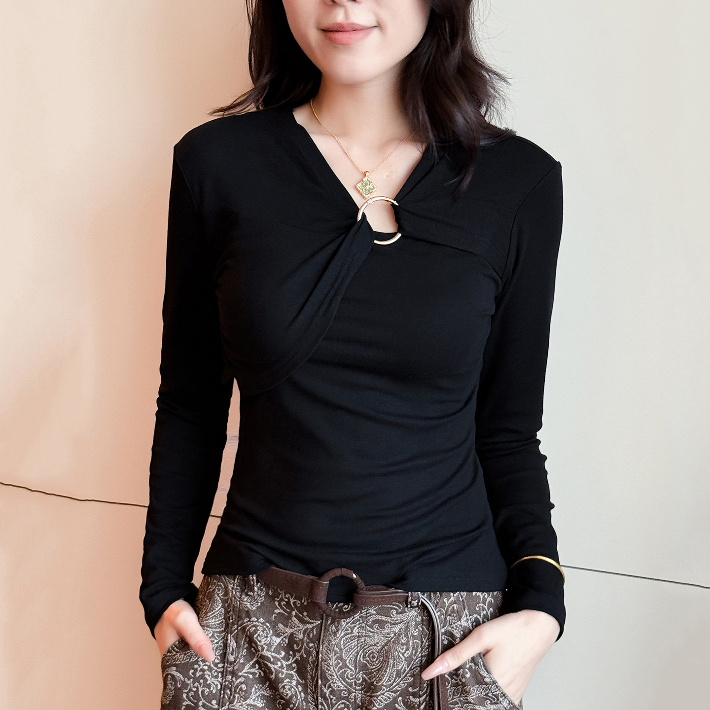 2025秋冬新款气质V领T恤女长袖小众设计感圆环上衣修身显瘦打底衫