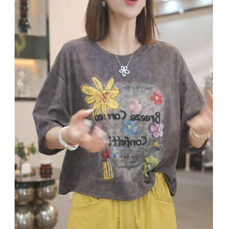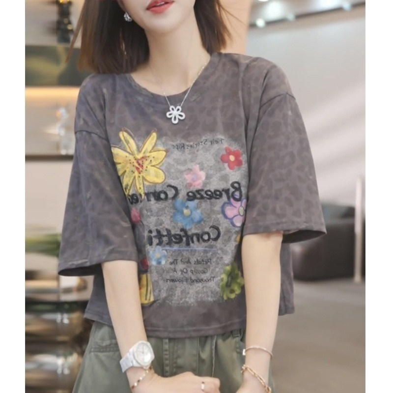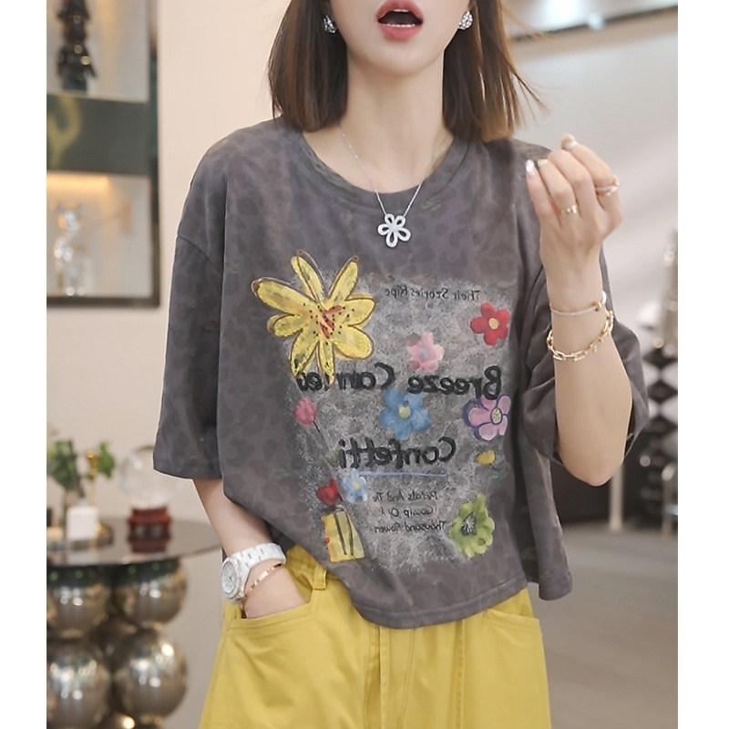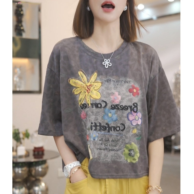 休闲圆领花朵印花短袖T恤女2026夏季新款小个子宽松百搭体恤上衣