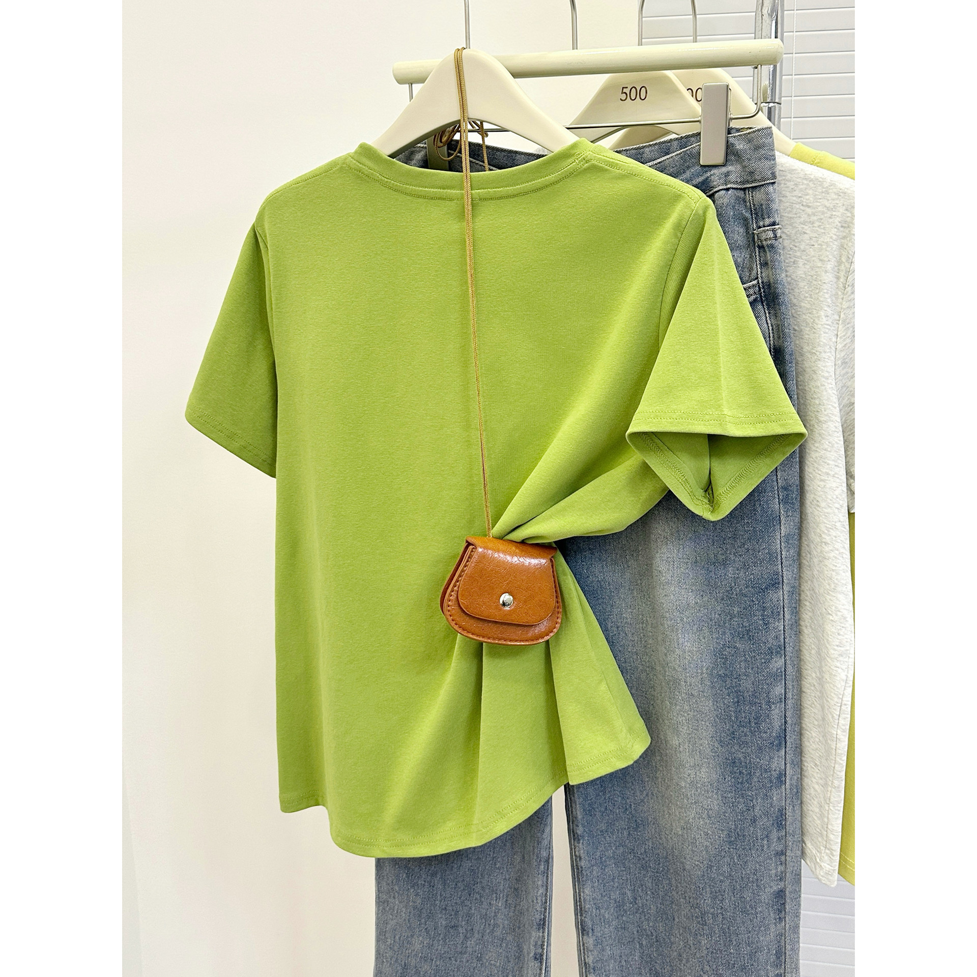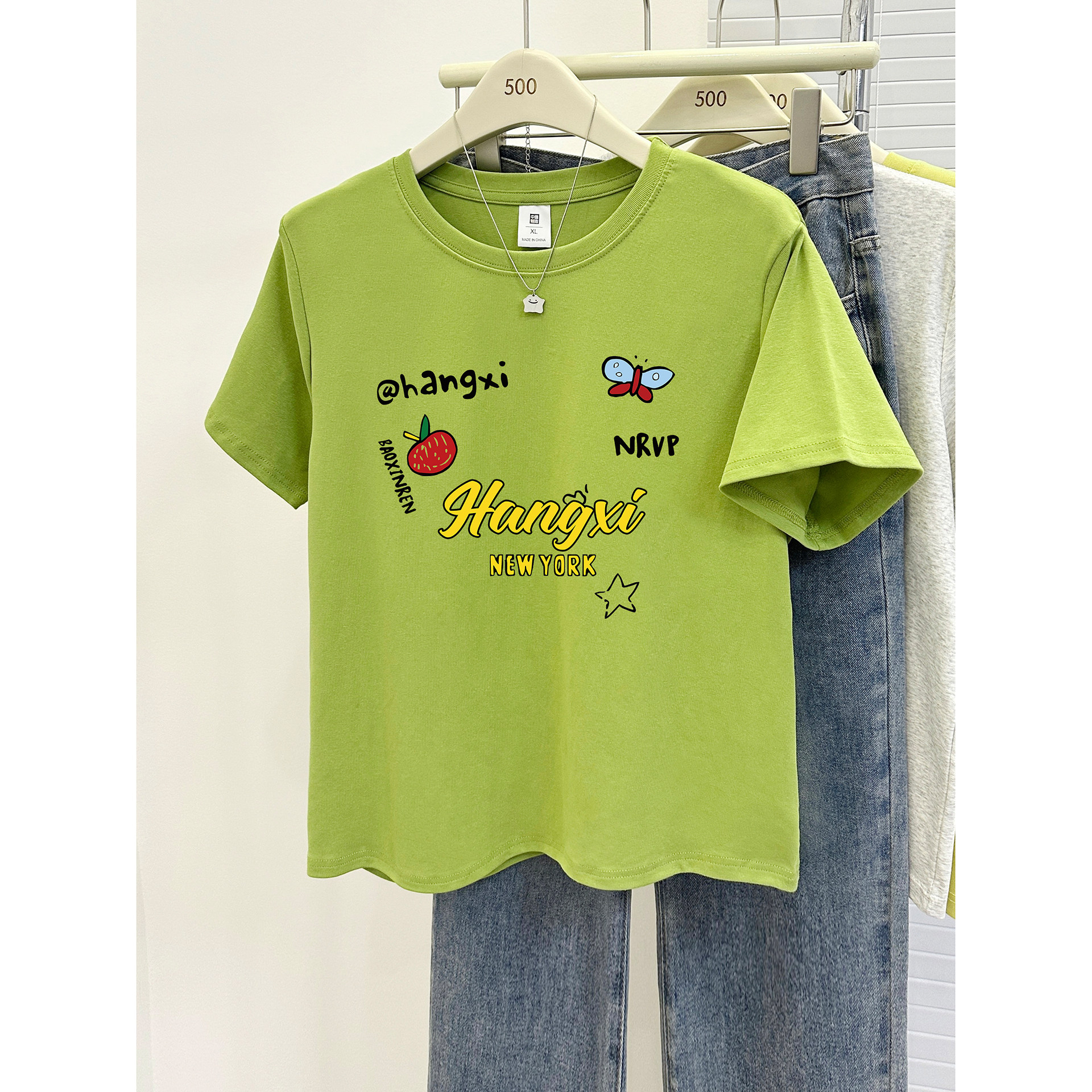 绿色短袖女款爆款2025新款大码遮肚子夏季时髦圆领200斤显瘦上衣