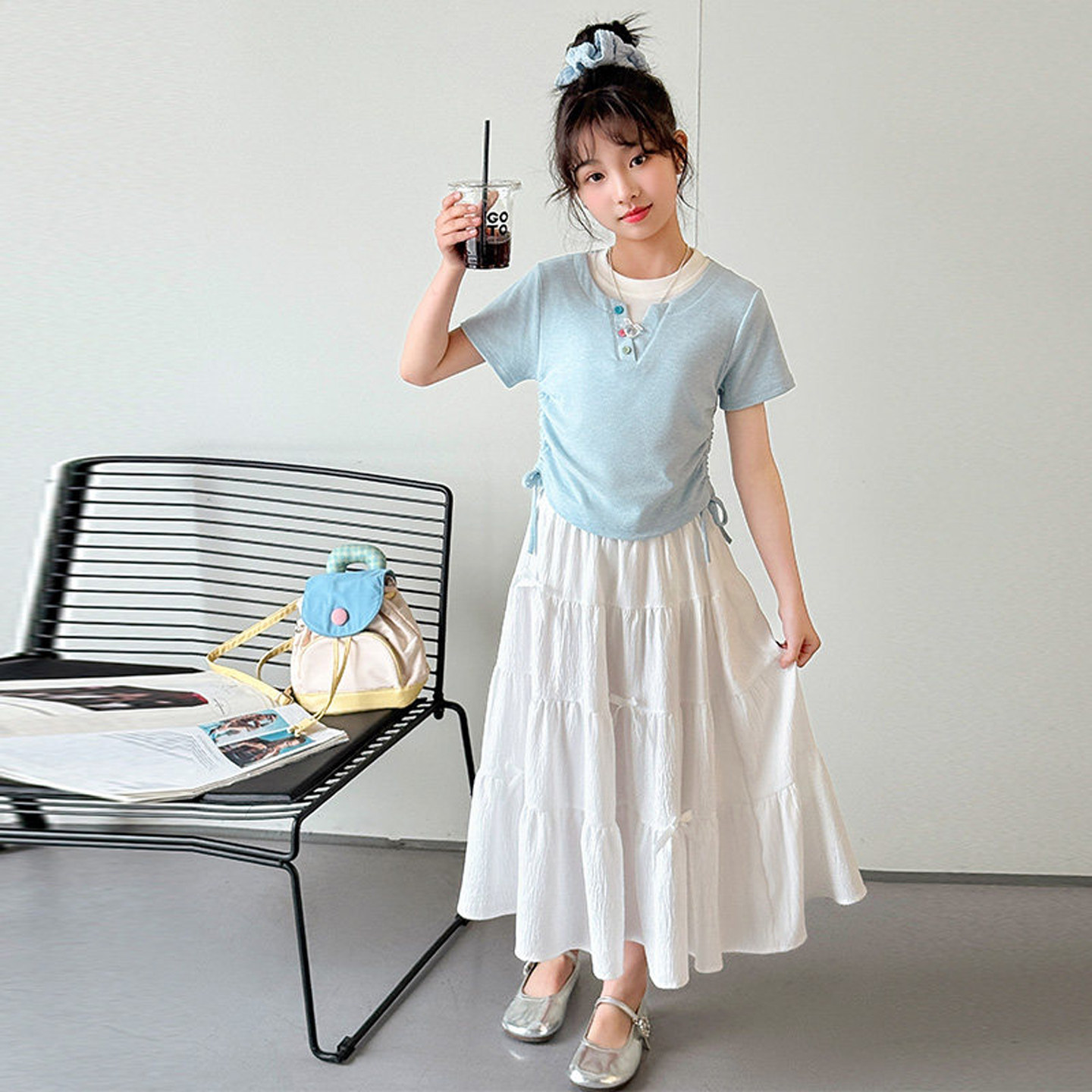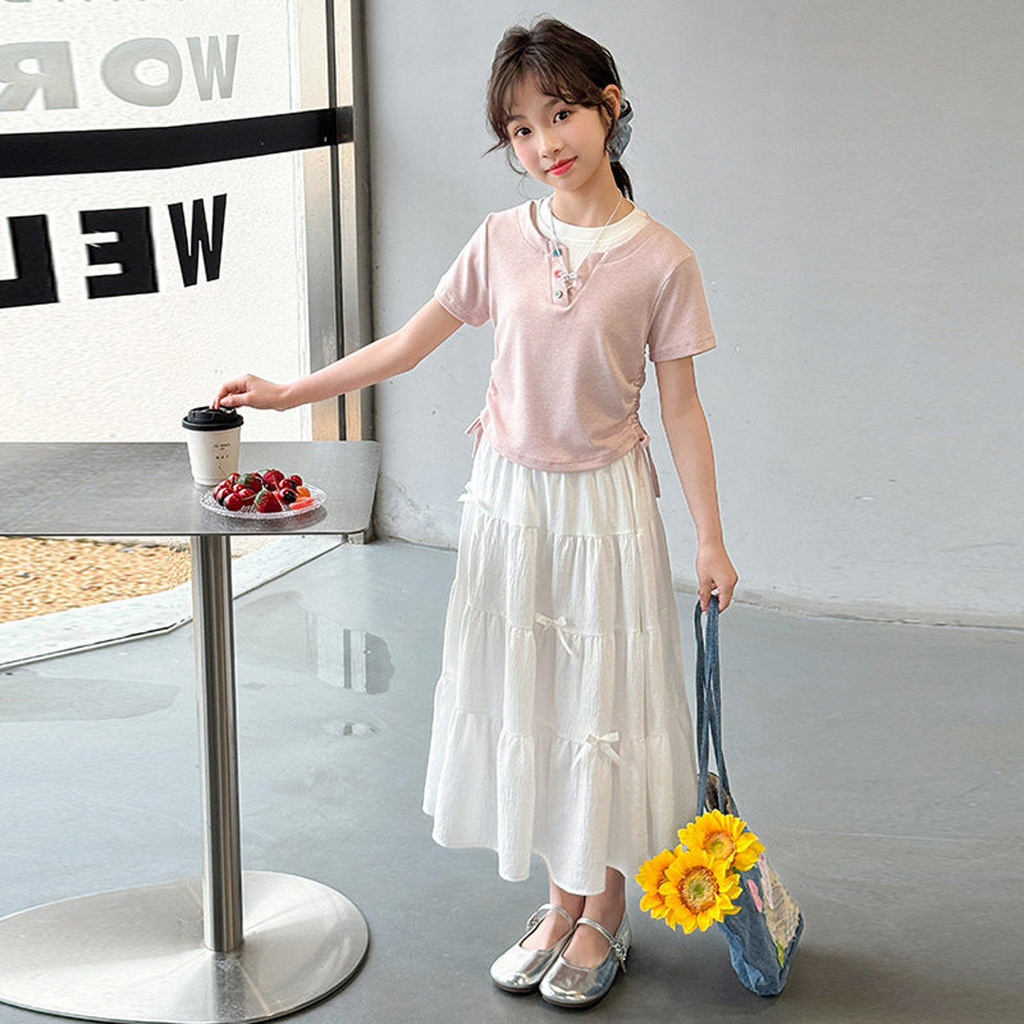 女童连衣裙夏季中大童韩版短袖T恤裙子套装儿童白色半身裙两件套