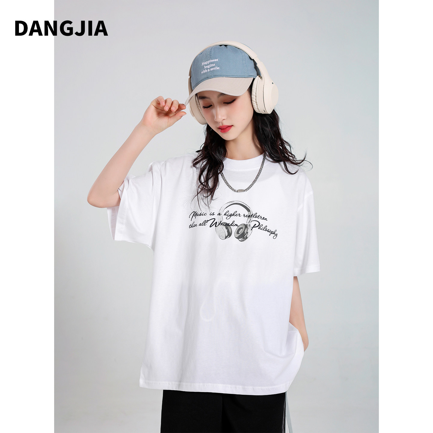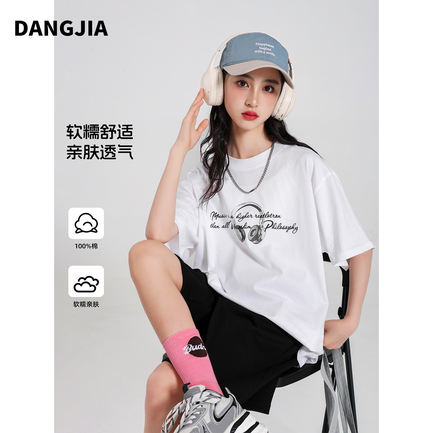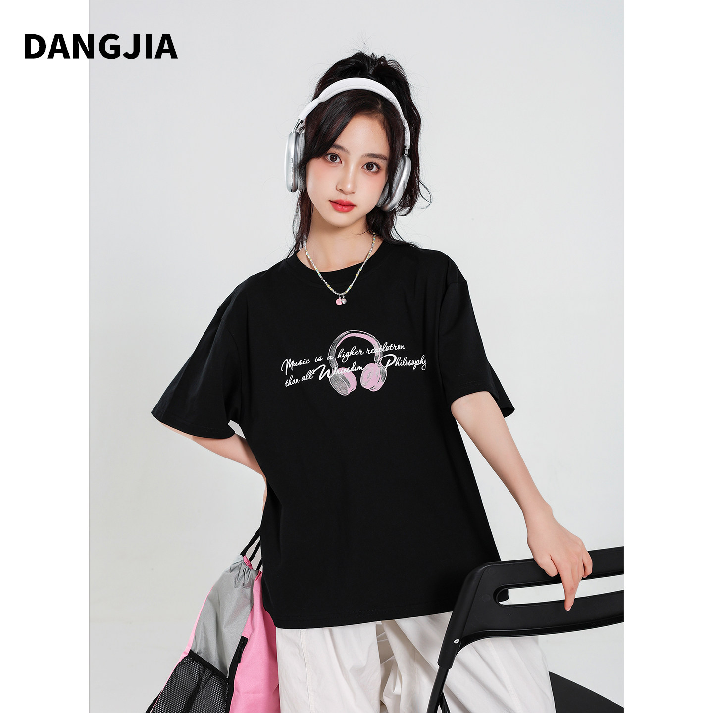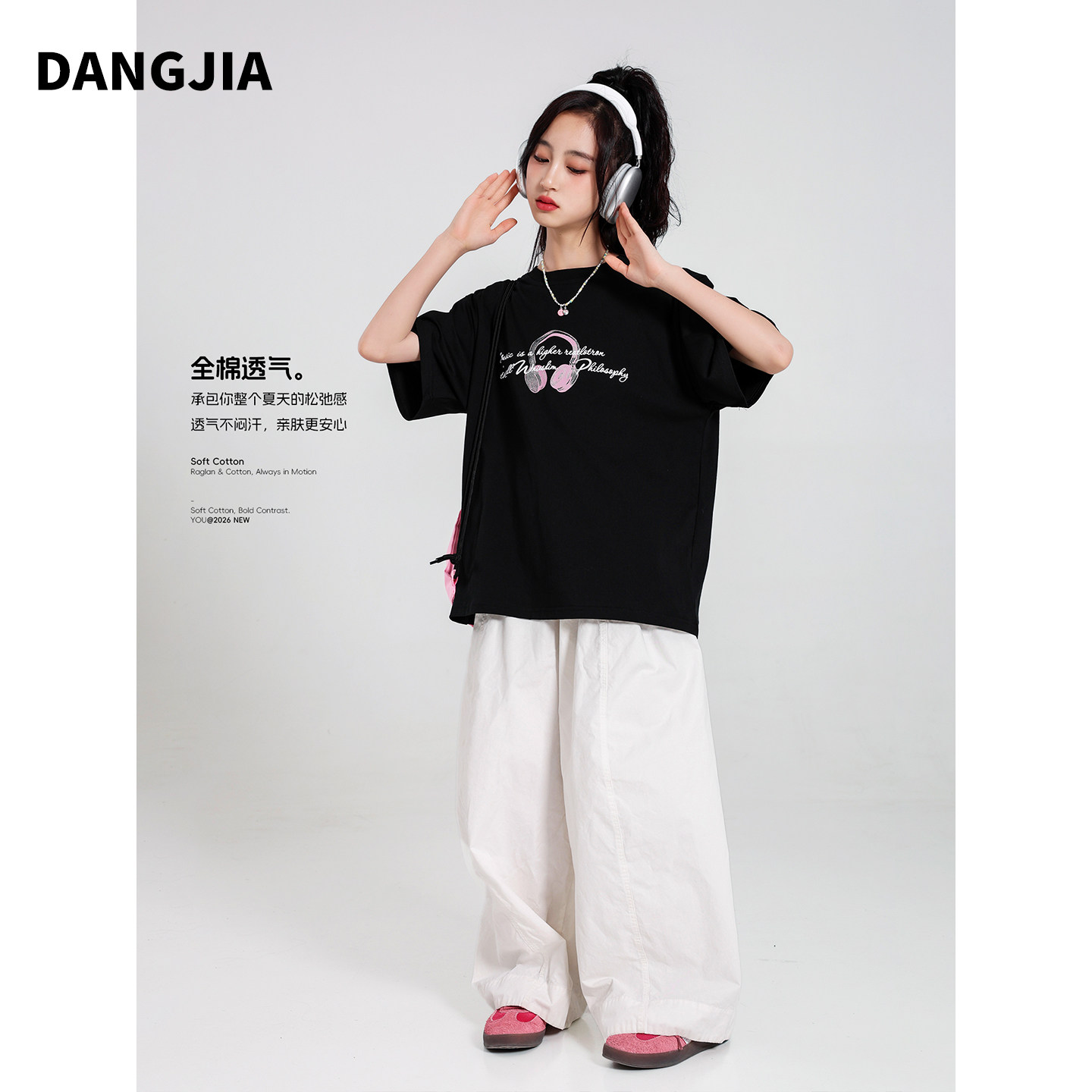 女大童短袖T恤2026新款夏装初中生女孩宽松纯棉圆领印花黑色上衣