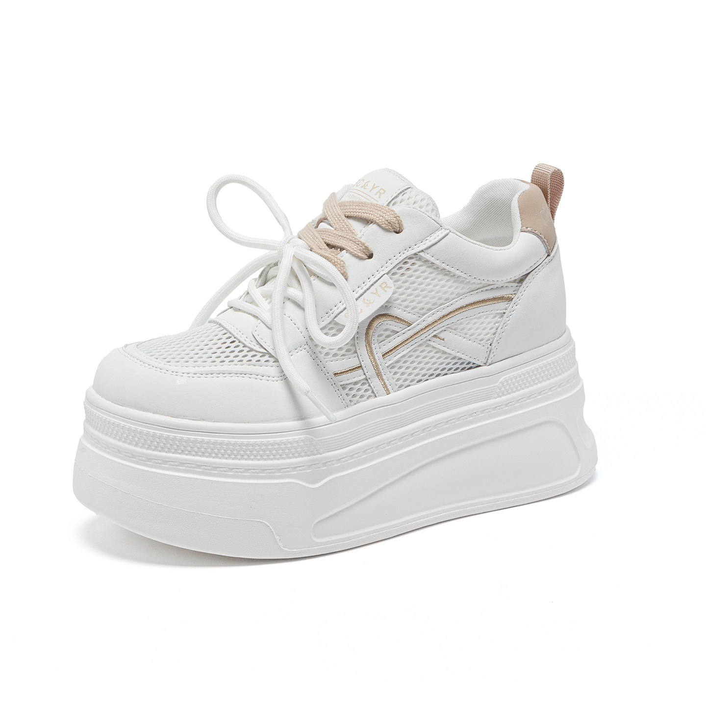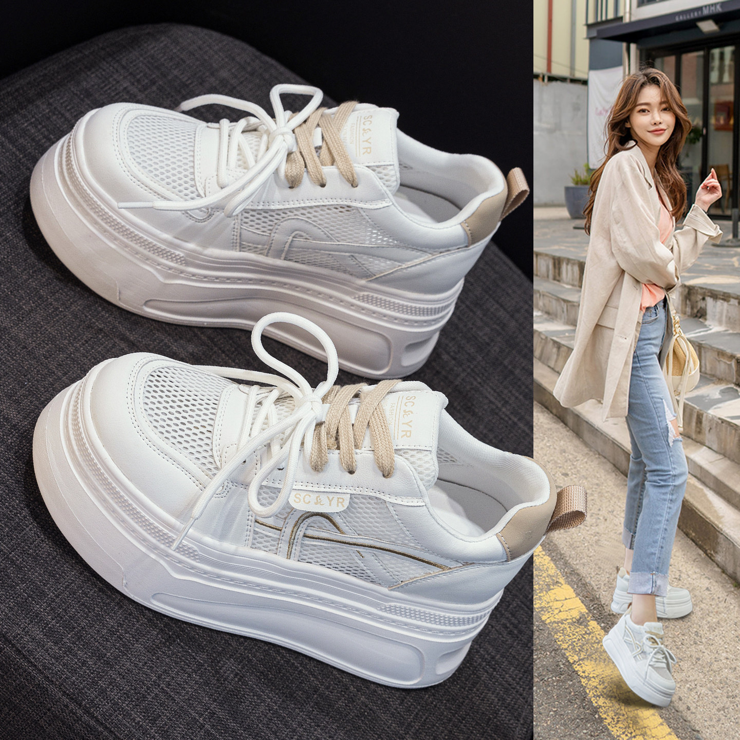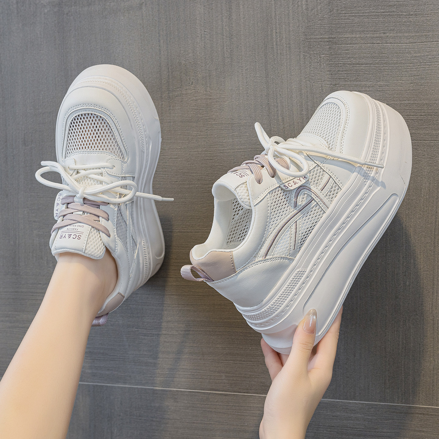 ZFCQ新款单网透气薄款厚底内增高小白鞋女款真皮2026夏季网面8cm