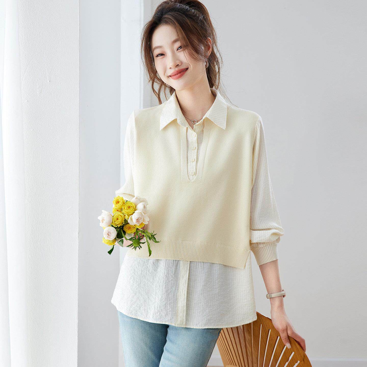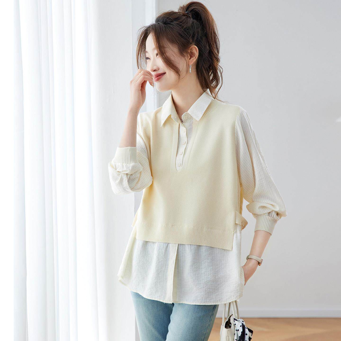 春装假两件上衣女款2026年新款衬衫领针织衫女时尚洋气女装打底衫