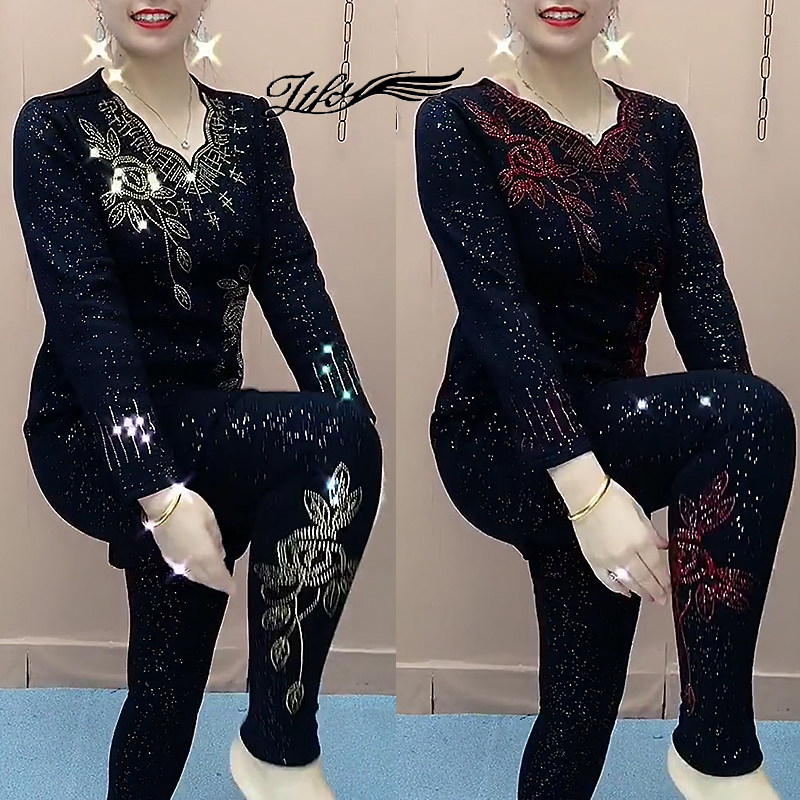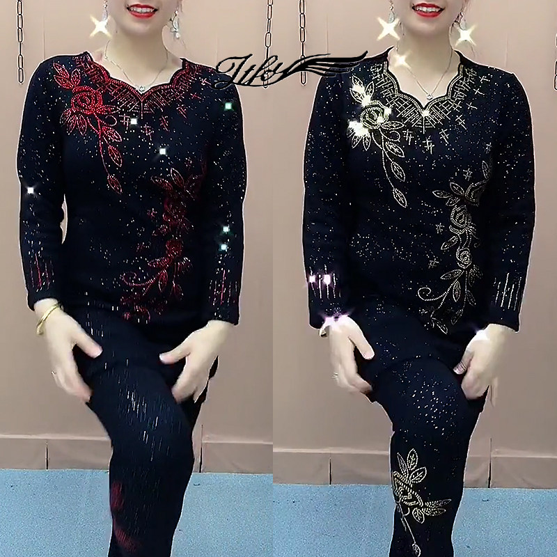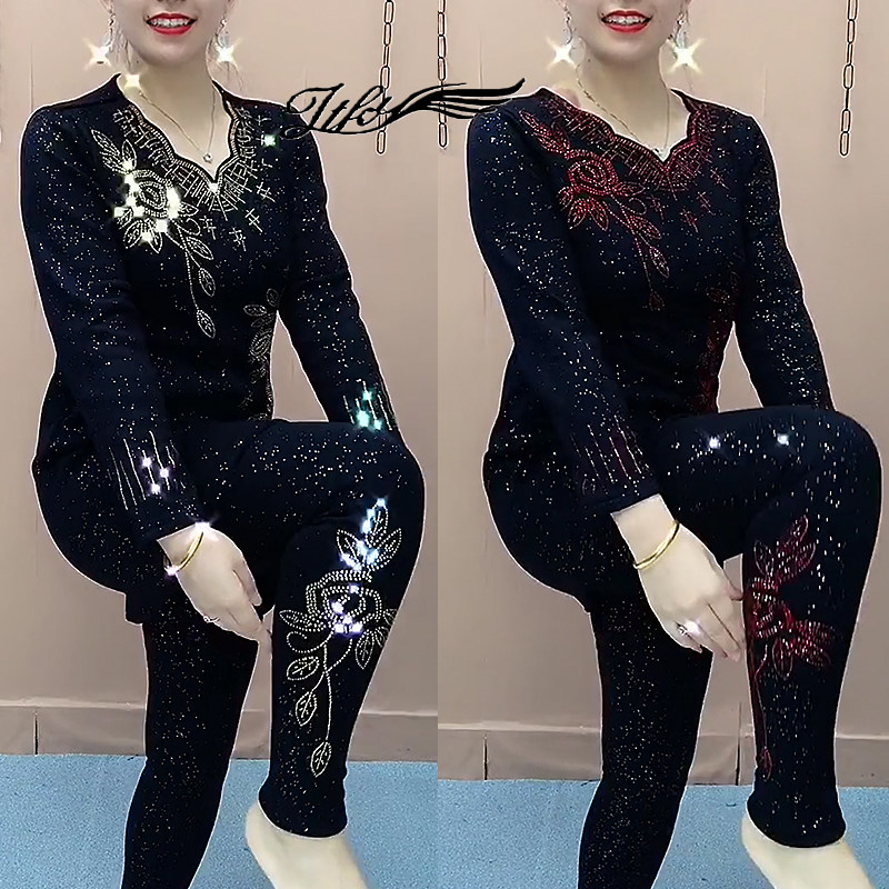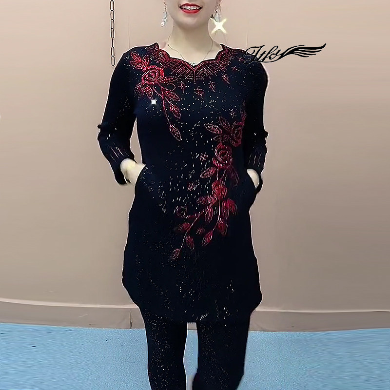 中老年妈妈套装女2025秋冬加绒烫钻弹力中长款连衣裙打底裤两件套
