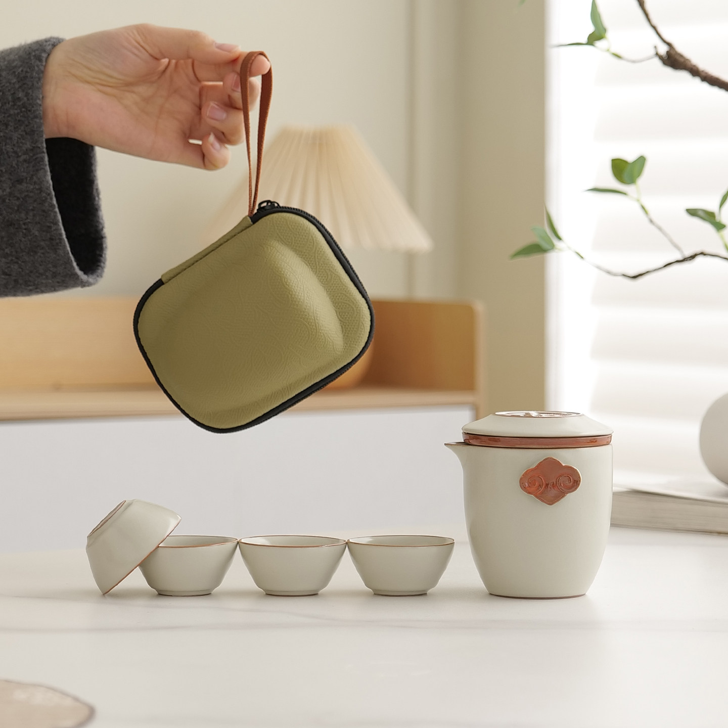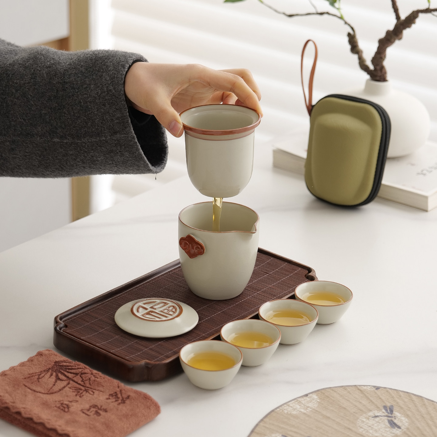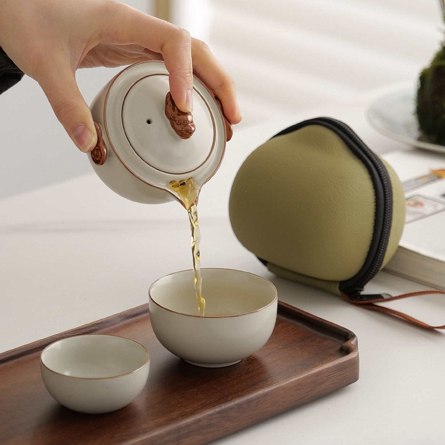 米黄汝窑旅行茶具小套装户外露营陶瓷快客杯一壶两杯便携式伴手礼