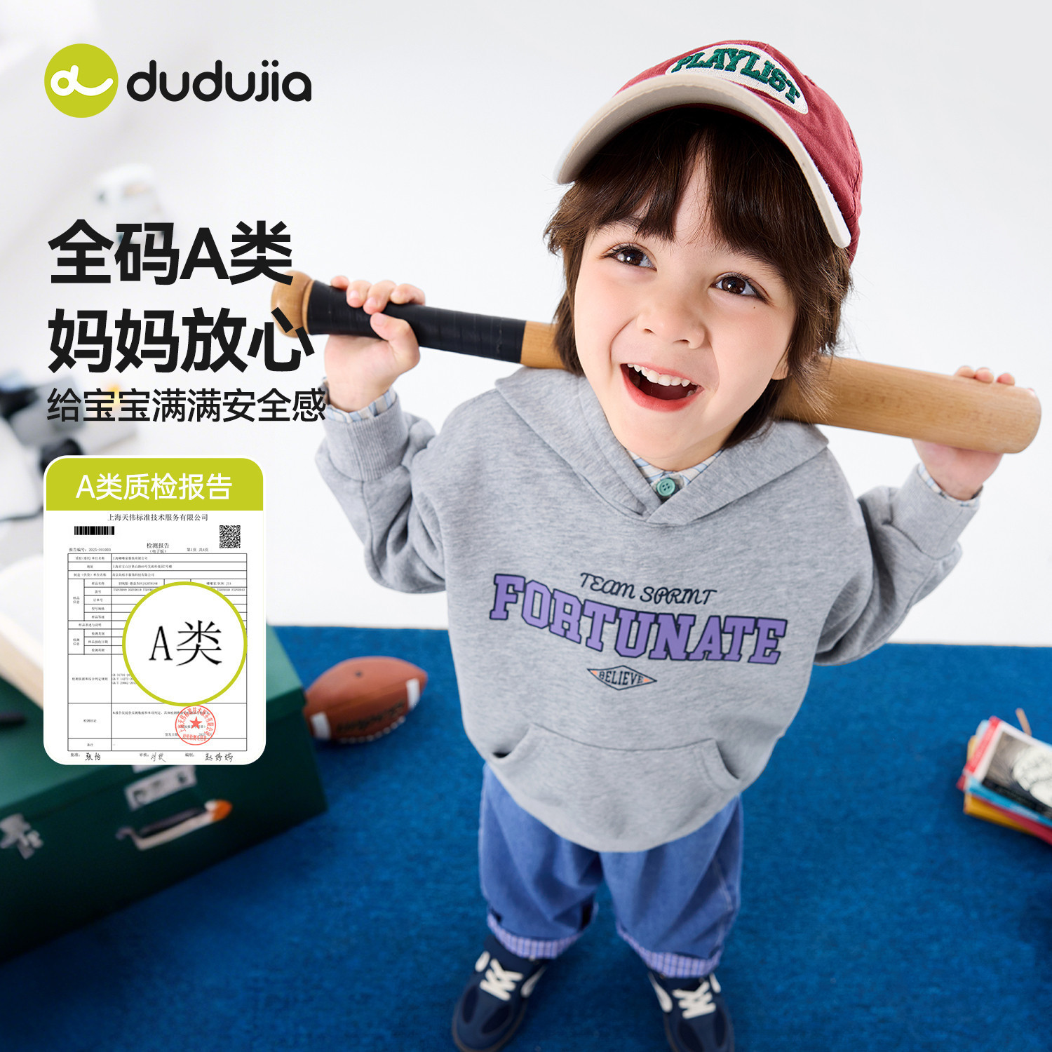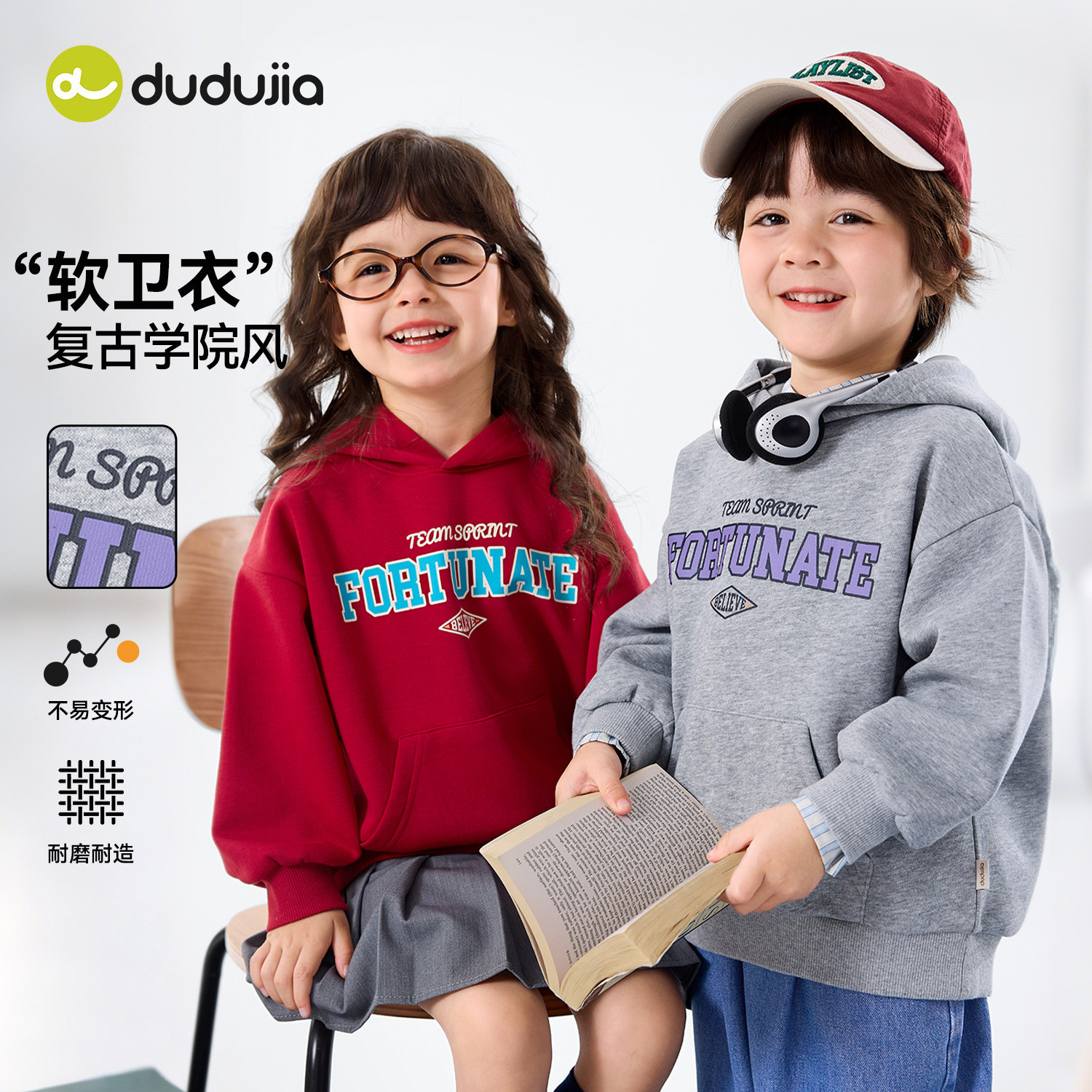 【美式】嘟嘟家男童卫衣春秋儿童红色宝宝连帽上衣学院风女童春装