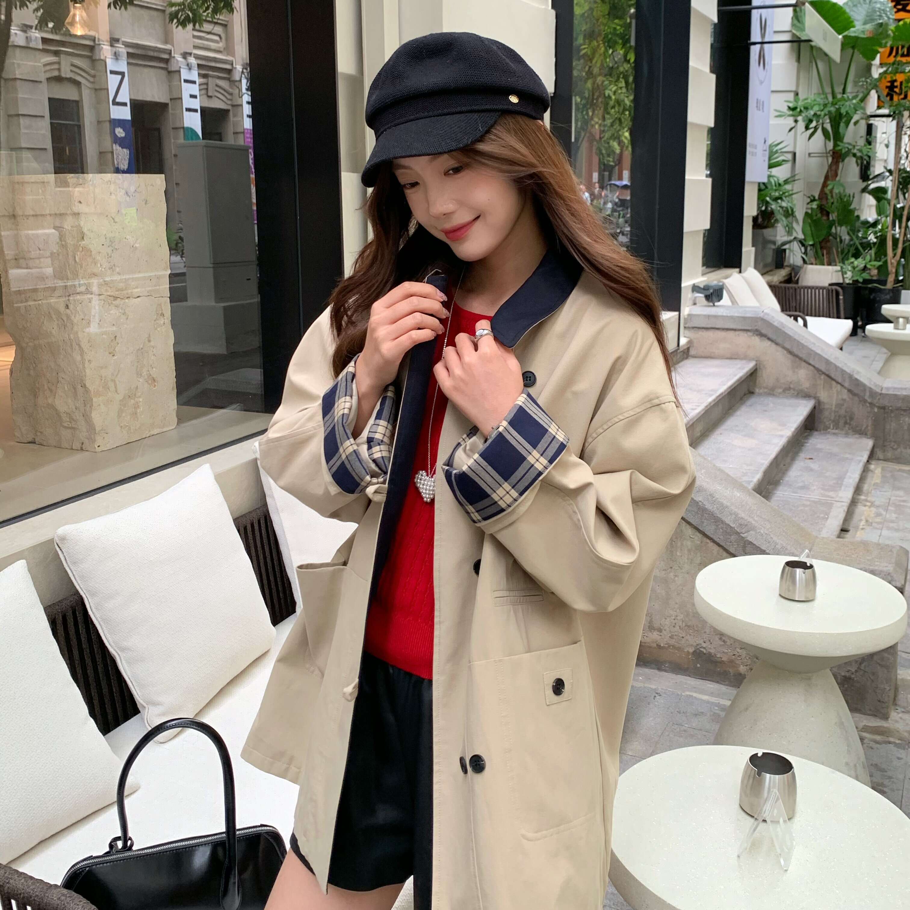 卡其色格纹拼接风衣外套女款2026春秋韩系复古百搭中长款时尚大衣