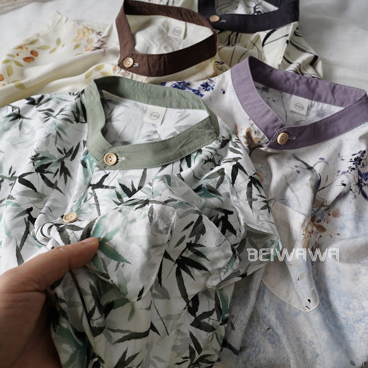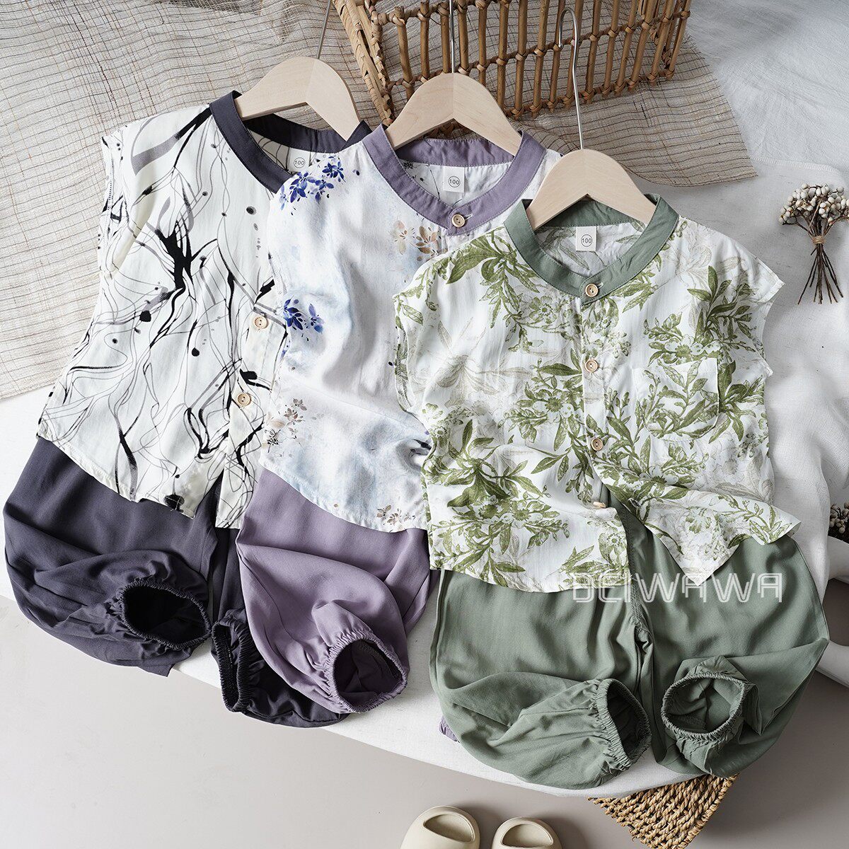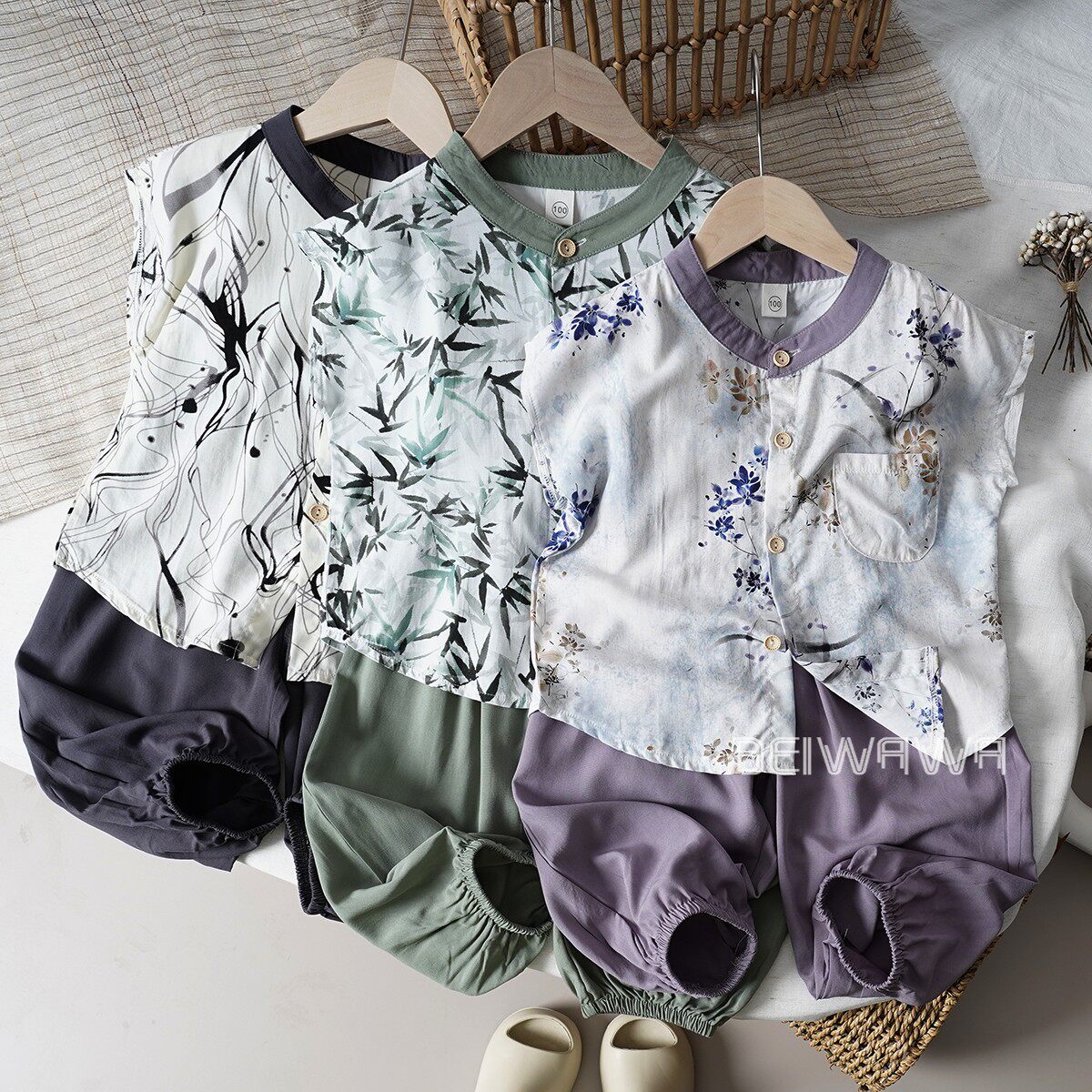 原创定制款儿童人造棉衬衣裤子套装 男童宝宝短袖长裤绵绸两件套