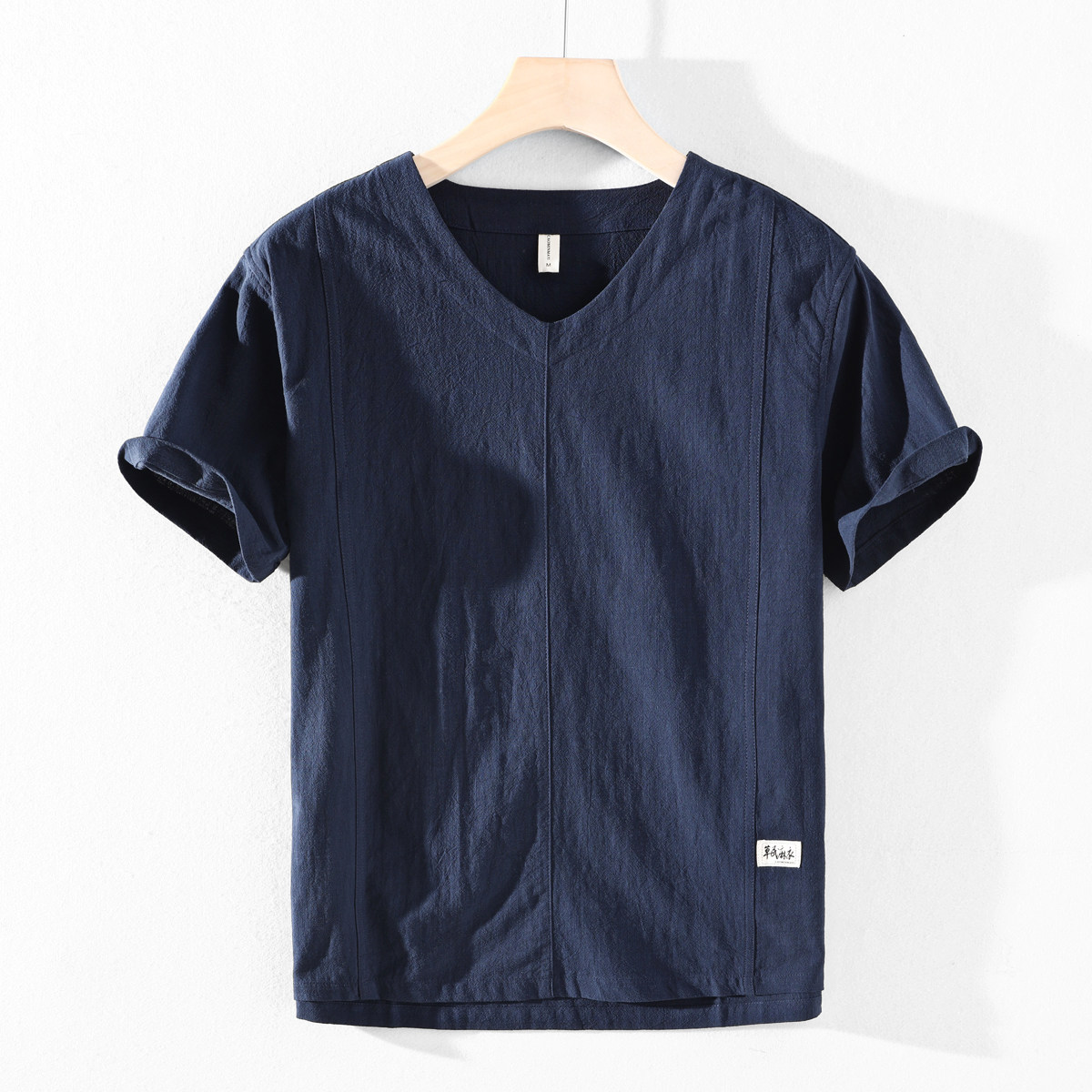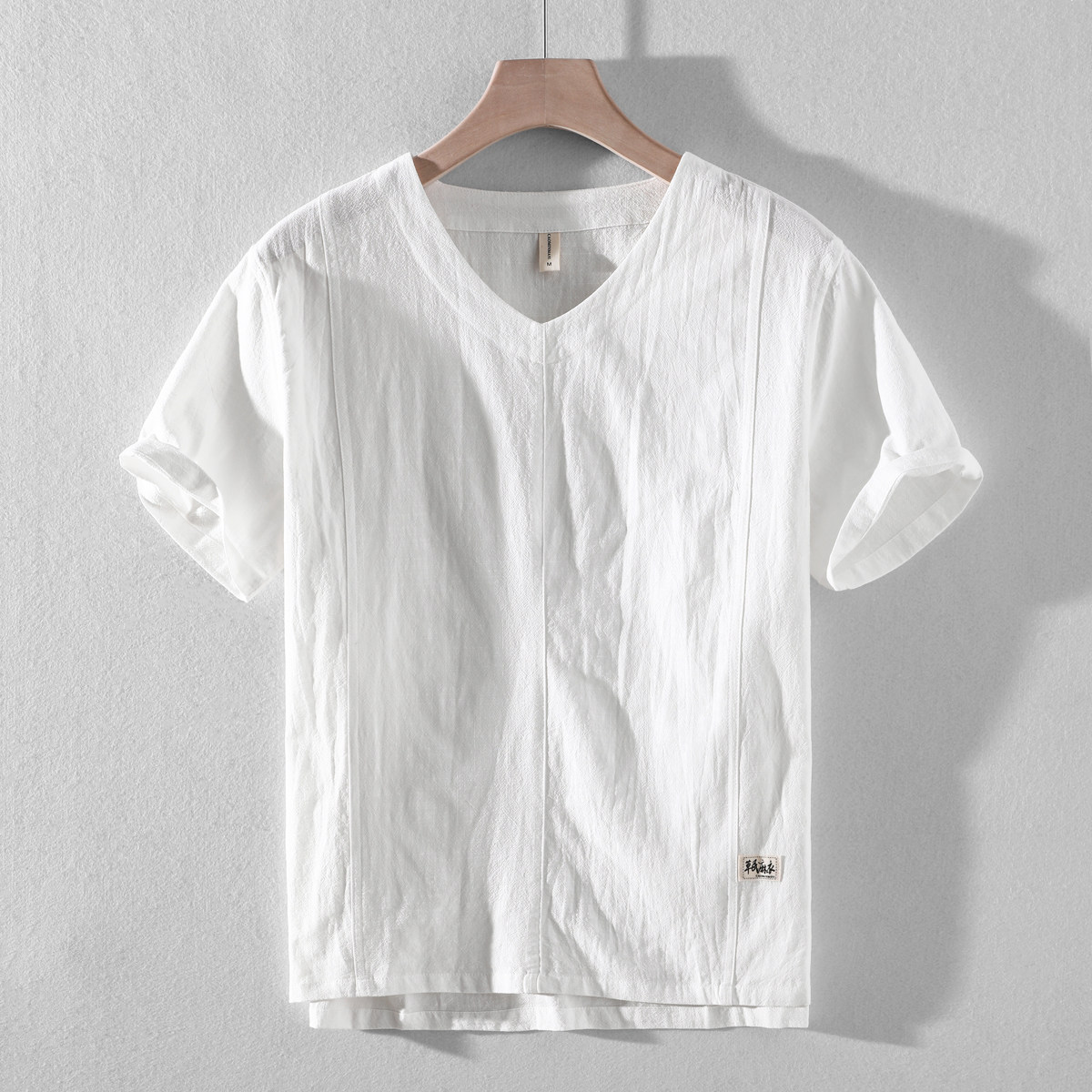 2026新款透气棉麻T恤男亚麻衬衫草民麻衣男款V领棉麻短袖衬衫上衣