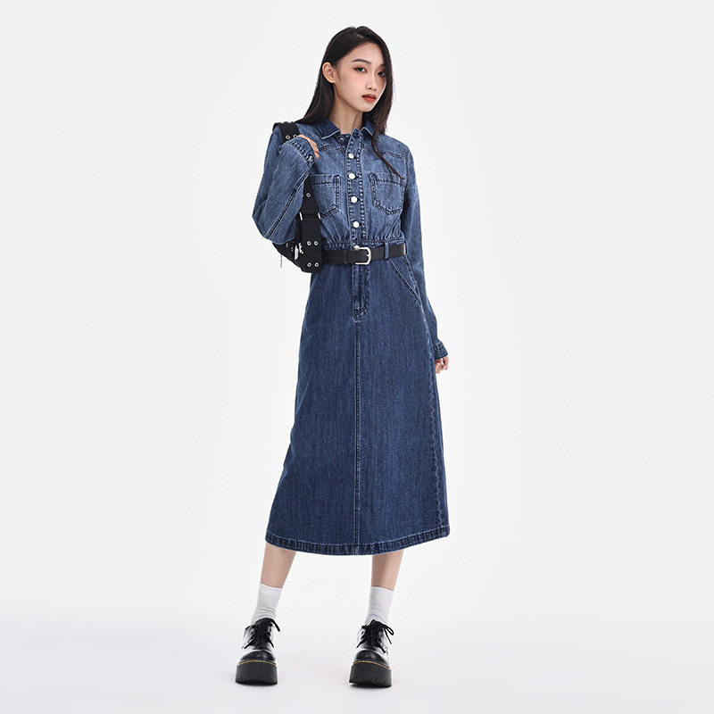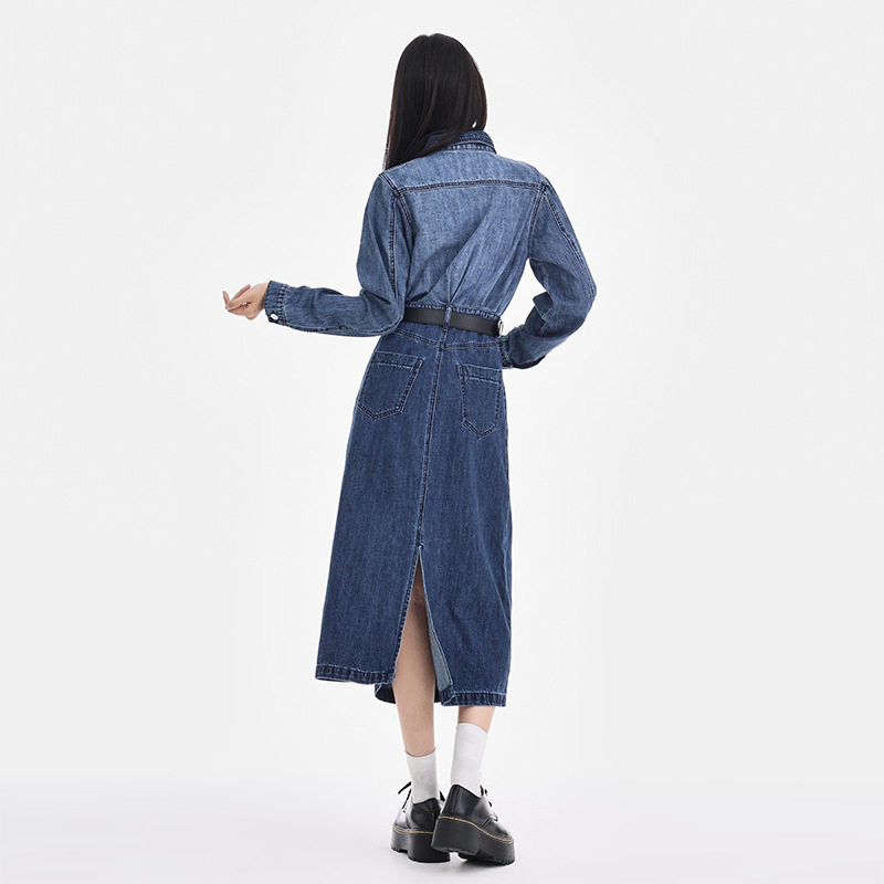 渐变蓝牛仔连衣裙女2025夏季新款收腰设计显瘦小个子长袖中长裙子