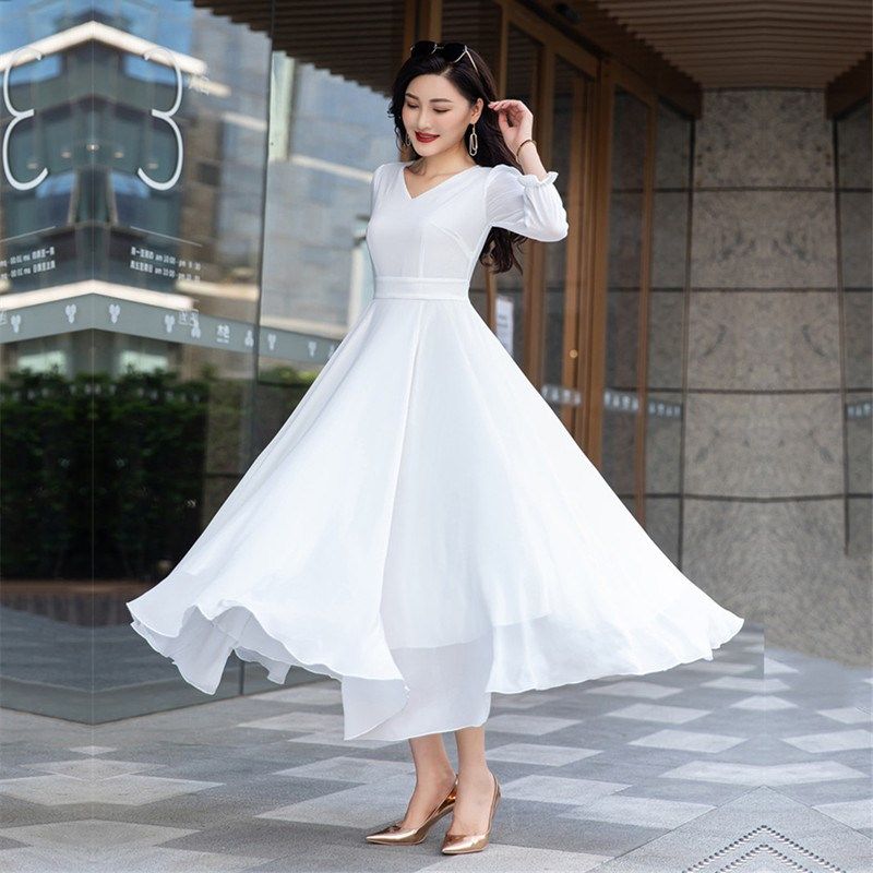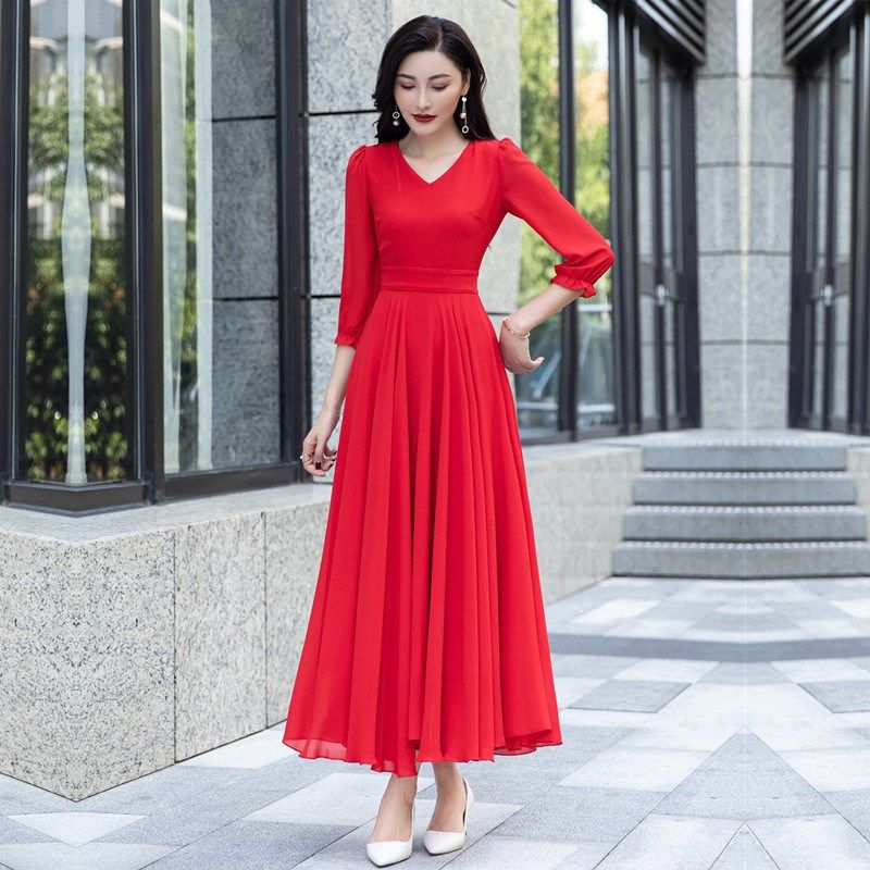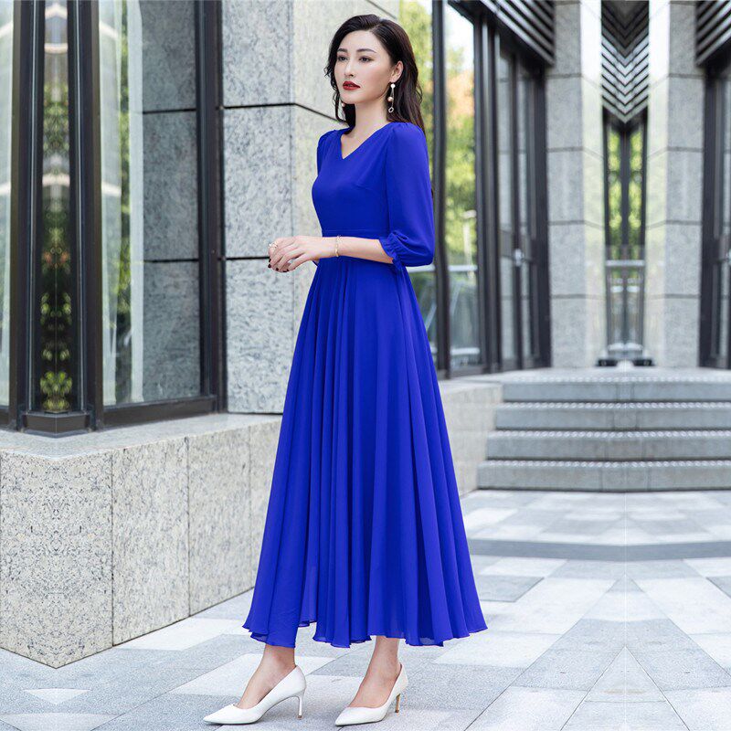 2025春季新款高个子到脚踝雪纺连衣裙收腰显瘦超长款拖地长裙大摆