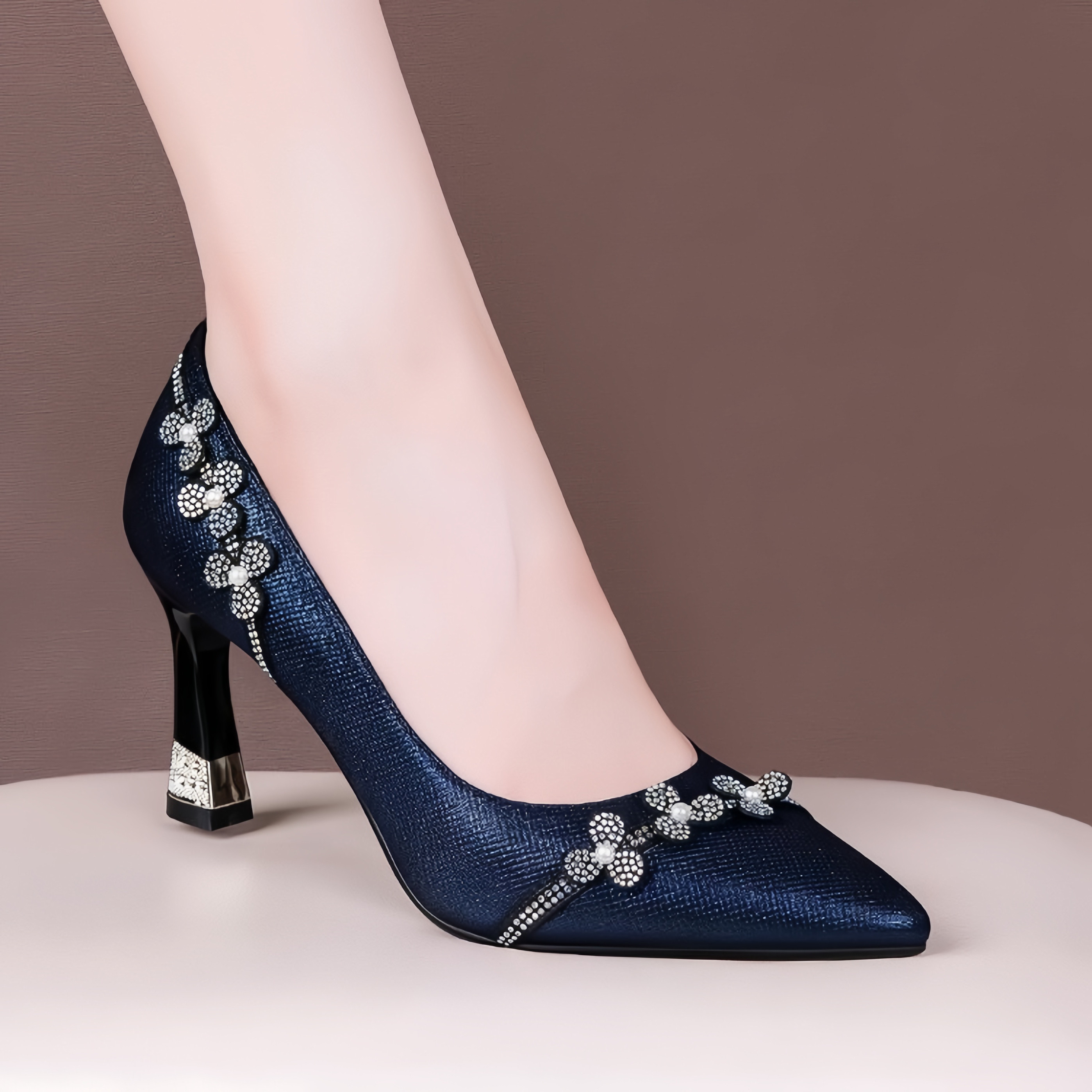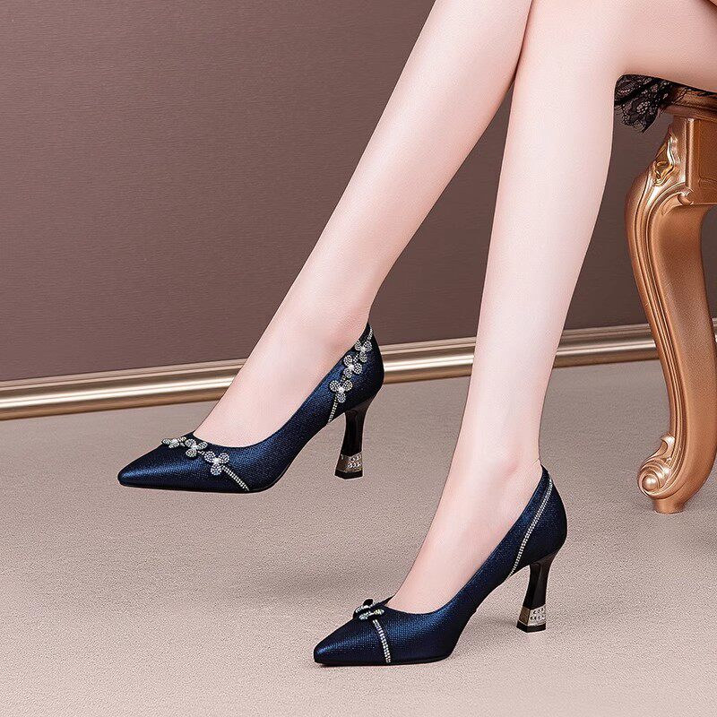 法式真皮高跟鞋女2026春夏新款粗跟尖头水钻时尚伴娘中跟高跟鞋女