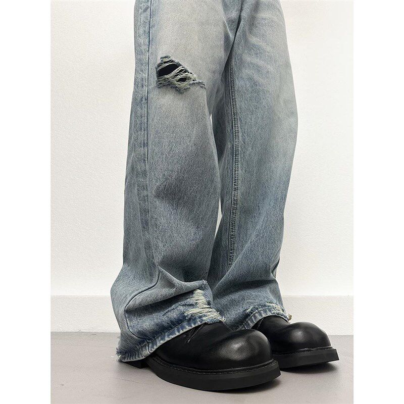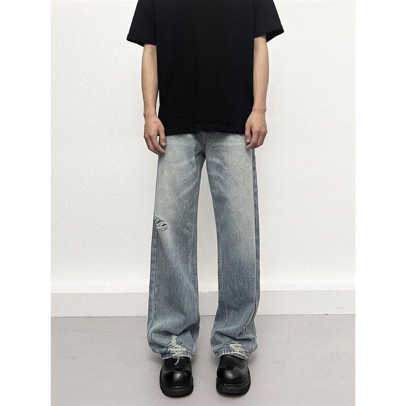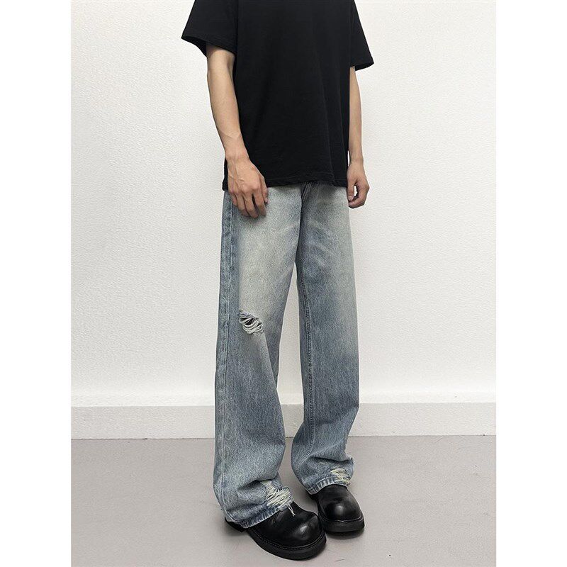 复古蓝色裤脚破洞牛仔裤男女款夏季美式高街直筒裤阔腿宽松长裤子