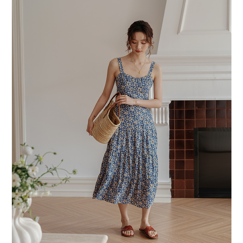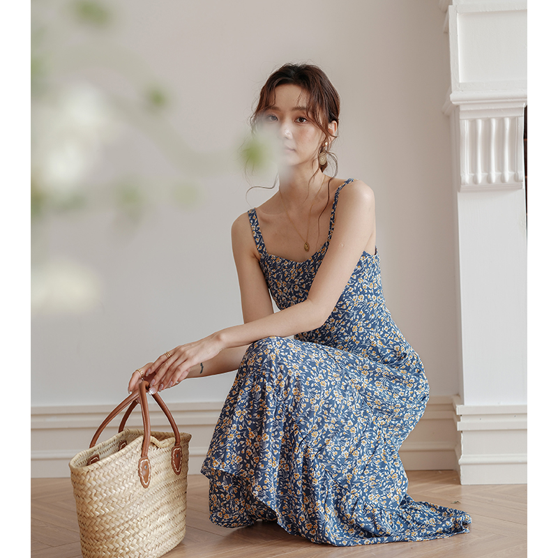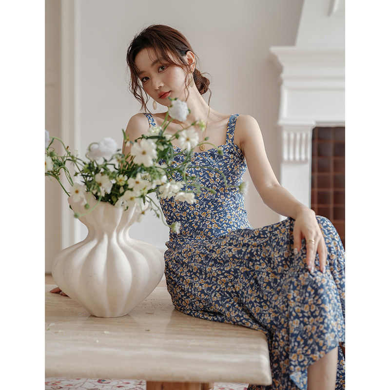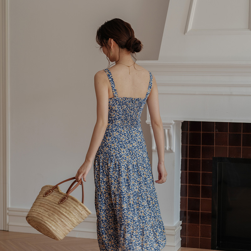 法式复古小碎花森系显瘦背带吊带连衣裙中长款气质别致修身吊带裙